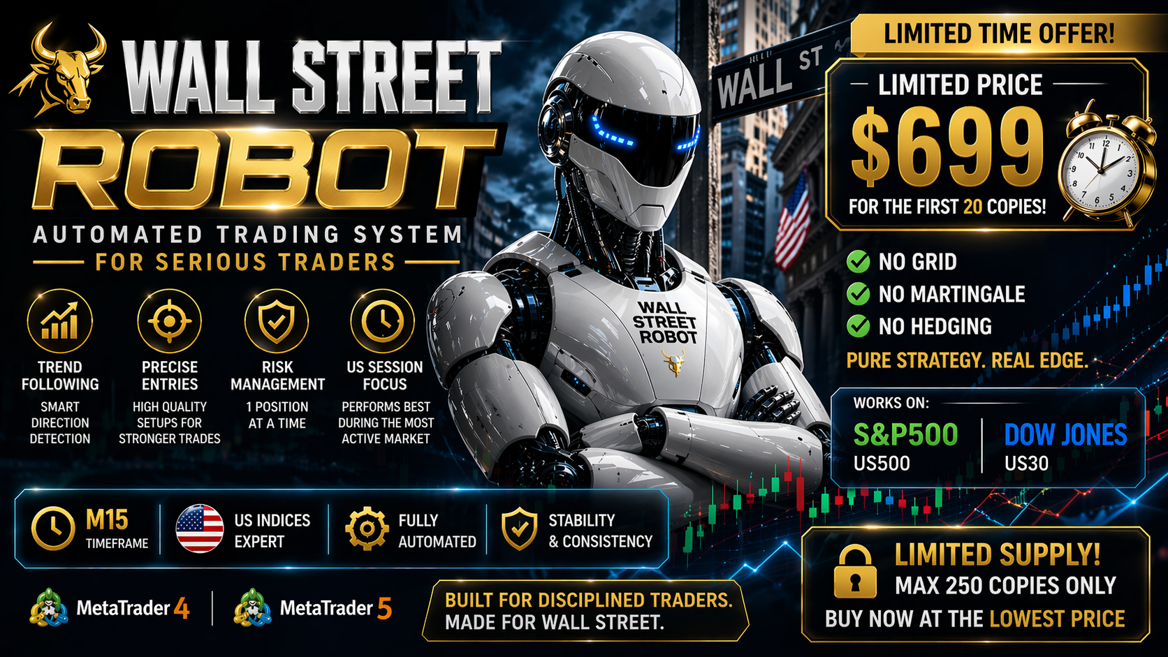 Wall Street Robot is aprofessional trading systemdeveloped exclusively for US stock indices, focused on S&P500 and Dow Jones. These markets are known for their high liquidity, structured movements and strong reaction to global economic flows, making them ideal for algorithmic trading strategies based on precision and discipline. By concentrating only on these indices, the system is able to adapt closely to their behavior, volatility patterns and intraday dynamics, instead of trying to operate on multiple unrelated markets. The robot operates on theM15 timeframe, which provides the optimal balance between signal quality and trading frequency. The strategydoes not use grid, martingale or hedging techniques. At any given time there isonly one position, managed with predefined Take Profit, Stop Loss and Break Even logic. This ensures full control over risk and eliminates the possibility of uncontrolled exposure. The system is designed to maintain stability and consistency, rather than chasing aggressive gains at the cost of high drawdown. Wall Street Robot includestwo management modes. The Fixed mode allows users to manually define Take Profit, Stop Loss and Break Even levels in points, giving full control over trade parameters. The Dynamic mode uses volatility based calculations to automatically adjust position management according to current market conditions. This provides flexibility for both conservative and more advanced users. The robot is available forMetaTrader 4 and MetaTrader 5platforms. It features a clean and professional panel displaying key information such as trend direction, market volatility, active position details and current operating mode. The system is designed to be easy to use, while maintaining a high standard of execution and transparency. Wall Street Robot is compatible withProp Trading Firms.