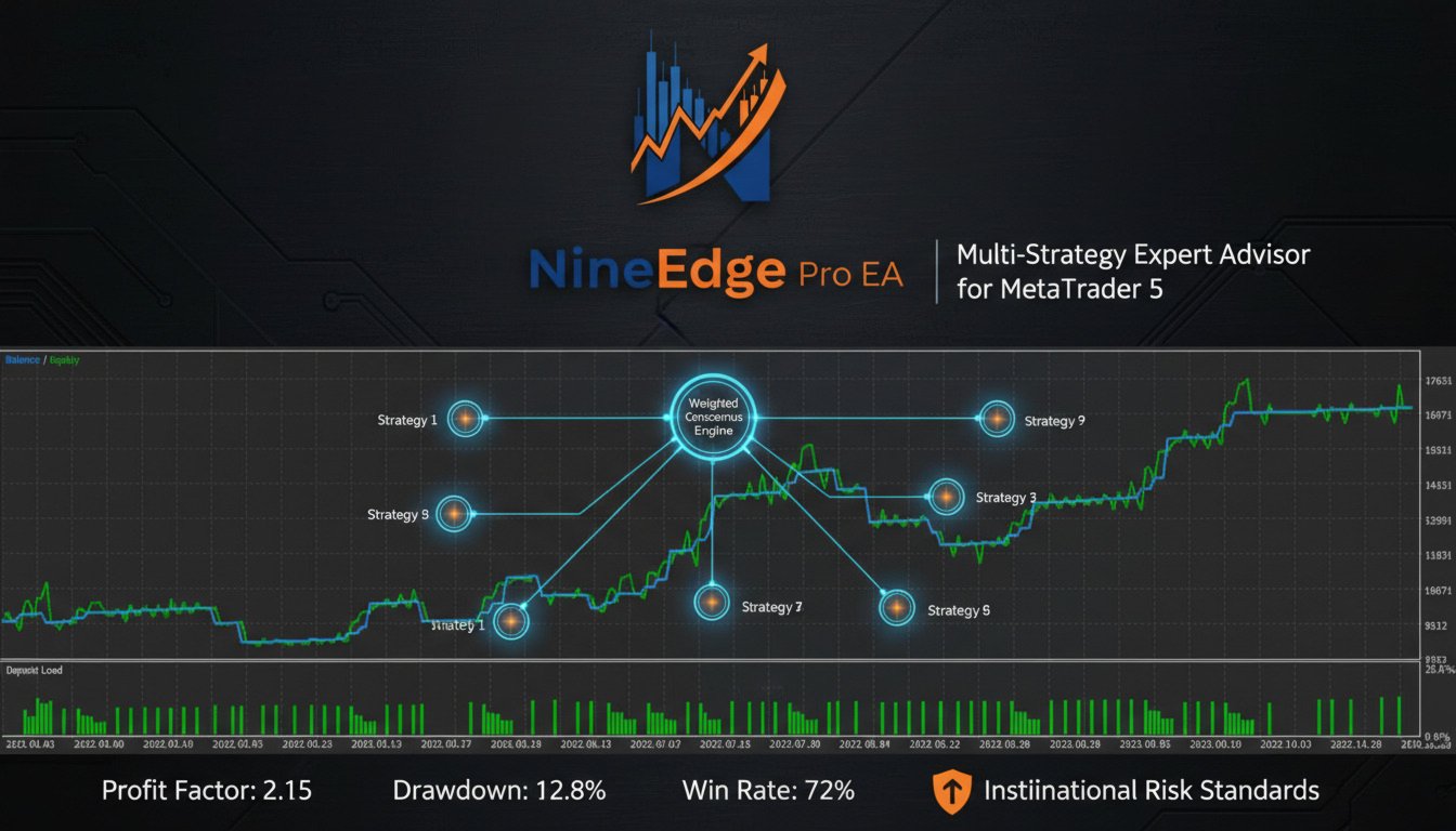 NineEdge Pro EA는 MetaTrader 5 플랫폼용 자동매매 프로그램(Expert Advisor)으로, 여러 개의 독립적인 거래 로직 모듈을 하나의 통합된 거래 실행 시스템으로 구성한 제품입니다.