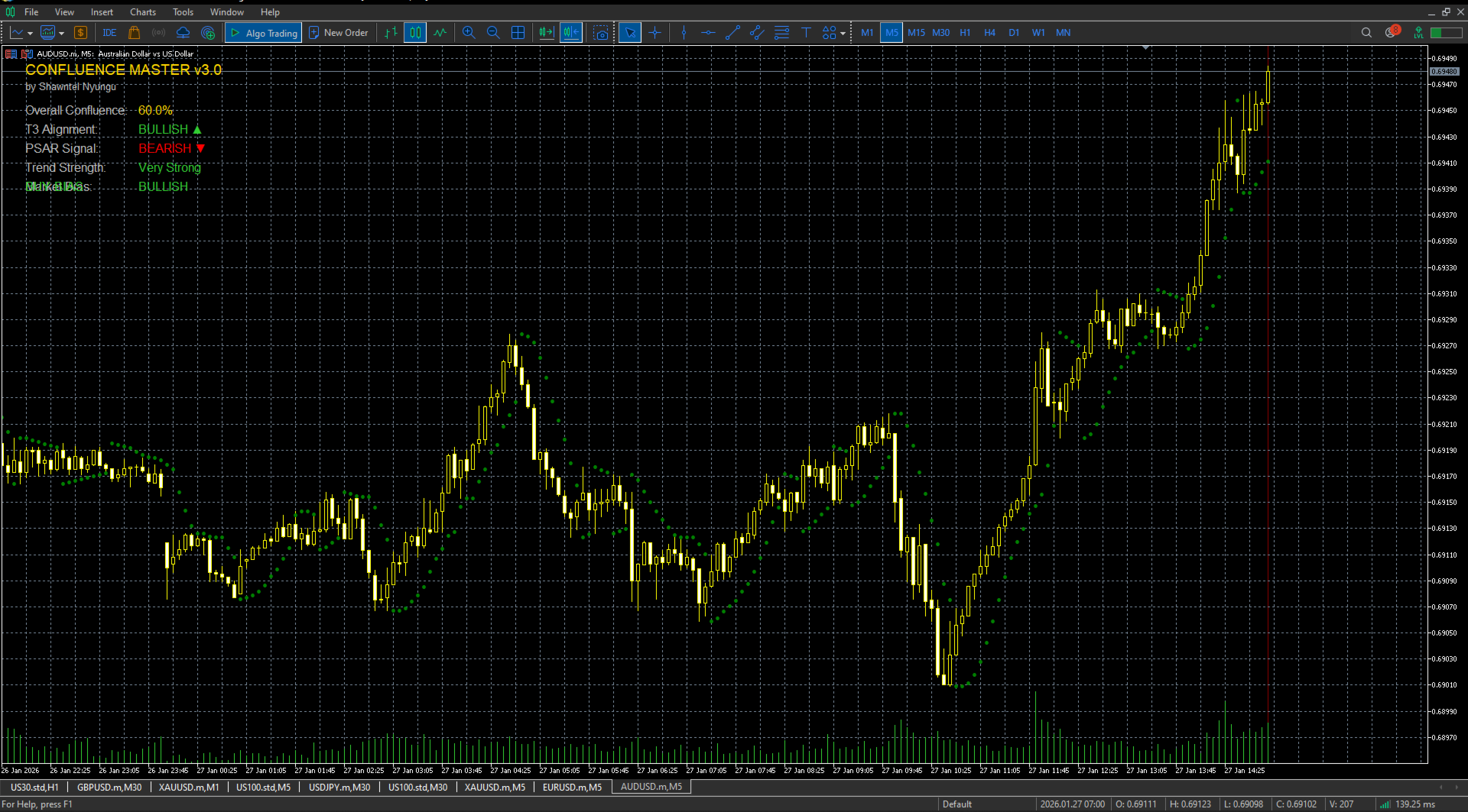 Confluence Master is an advanced technical analysis indicator that combines three powerful trading methodologies into a single, comprehensive system. By integrating T3 Moving Averages, Parabolic SAR, and Heikin-Ashi candlesticks, this indicator provides traders with a multi-layered approach to market analysis and signal generation. The system is designed to identify high-probability trading opportunities through the convergence of multiple technical factors, offering both visual clarity and actionable trading signals.