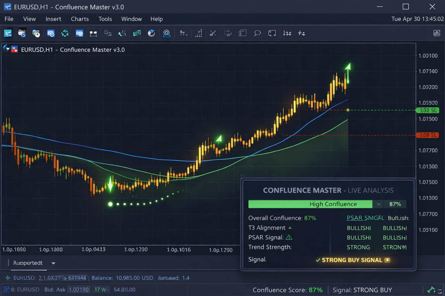 Real-time Metrics: Display of confluence score, trend strength, and signal bias