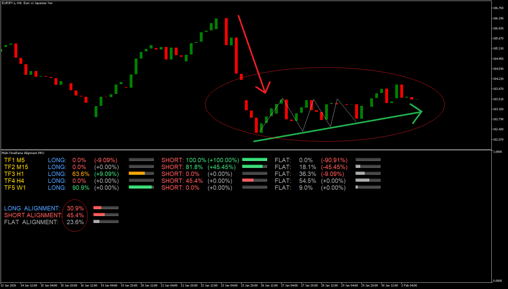 Multi-Timeframe Alignment PRO는 여러 관점에서 시장을 분석하고 불필요한 노이즈를 줄이며 진정한 정렬이 발생하는 순간에 집중할 수 있도록 돕는 도구입니다.