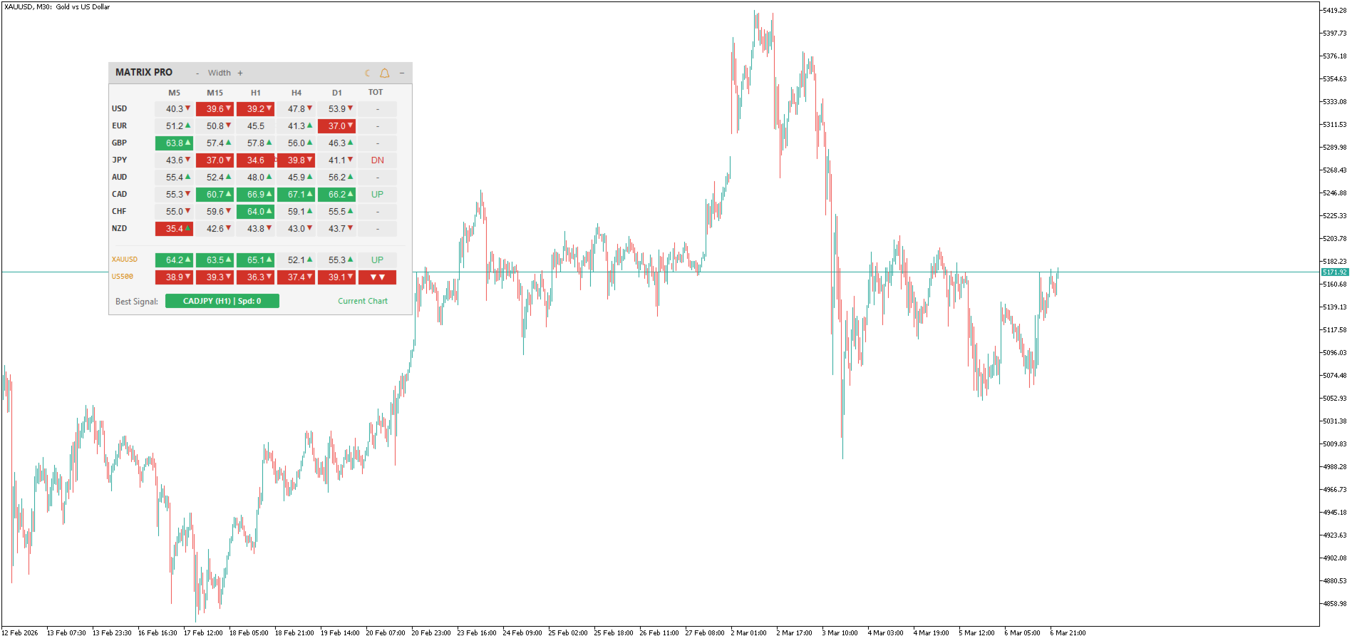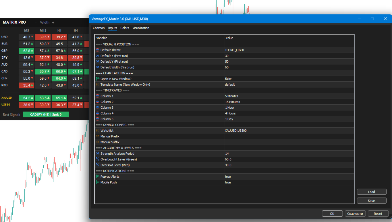 Vantage FX Matrix is a dashboard indicator designed for monitoring multiple assets. It combines a correlation matrix for 8 major currencies with a custom watchlist for other symbols provided by your broker (e.g., crypto, metals, indices).
