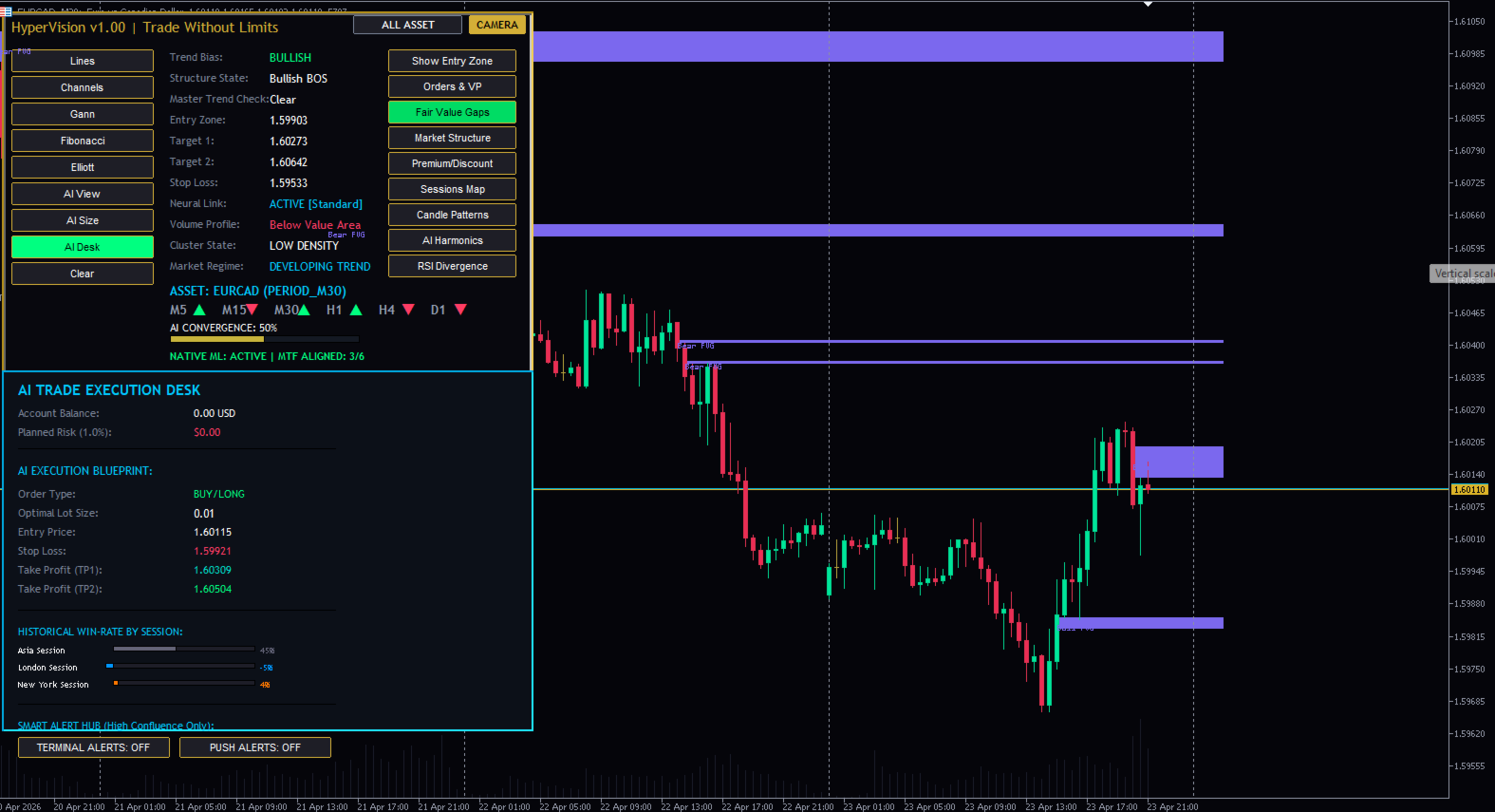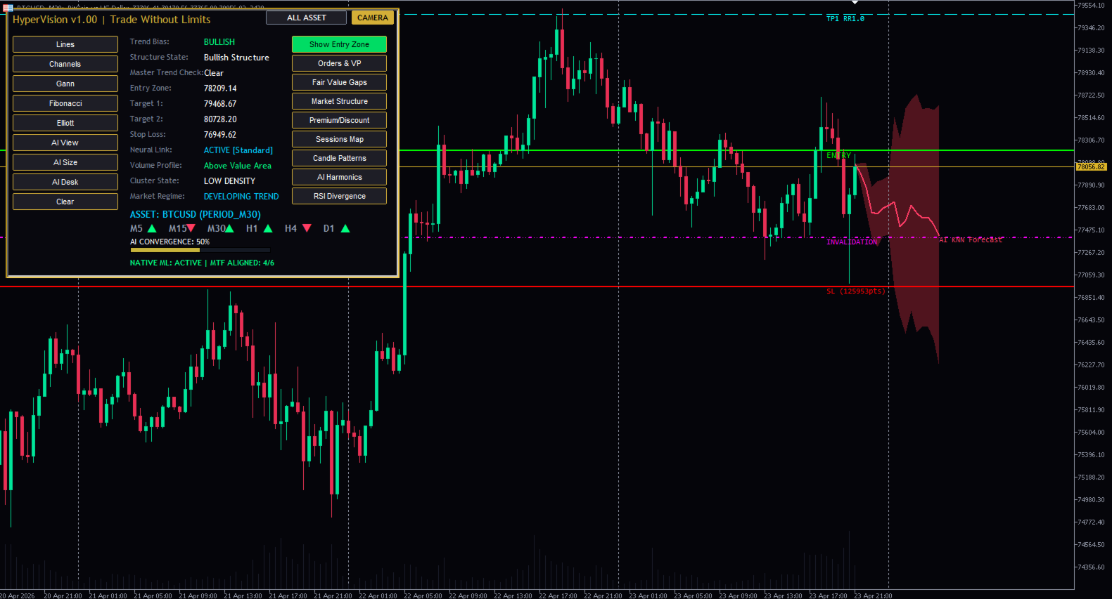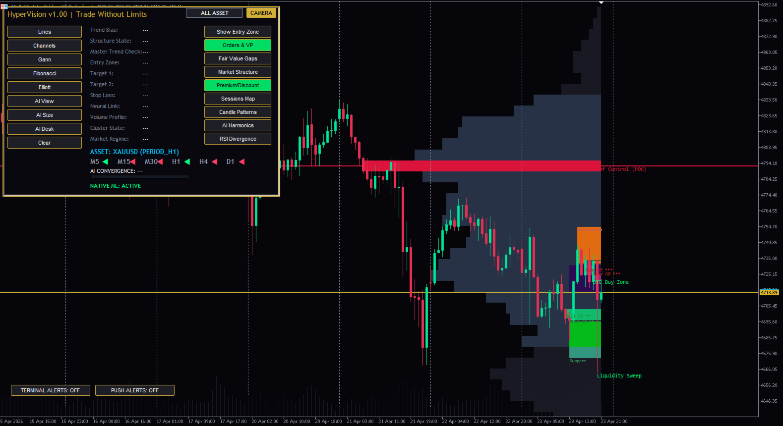 HyperVision AI 스마트 머니 지표 – SMC, 주문 블록, FVG, BOS 트레이딩 도구 (MT5) MetaTrader 5용 고급 스마트 머니 개념(SMC) 지표입니다. 시장 구조, 주문 블록, 높은 확률의 거래 영역을 정확하게 감지합니다. 기관 투자자처럼 거래하세요 – 개인 투자자처럼 거래하지 마세요 대부분의 트레이더는 시장의 실제 움직임을 제대로 이해하지 못해 실패합니다. HyperVision AI는 기관 투자자들이 사용하는 것과 동일한 원칙인 스마트 머니 개념(SMC)을 기반으로 구축되었습니다. HyperVision AI란 무엇인가요? HyperVision AI는 MT5용 강력한 올인원 트레이딩 지표로 다음과 같은 기능을 제공합니다. 시장 구조(추세 방향) 파악 구조 돌파(BOS) 및 CHoCH 감지 주문 블록(OB) 위치 파악 적정 가치 갭(FVG) 찾기 고확률 거래 영역 분석 주요 기능 스마트 머니 컨셉(SMC) 엔진 시장 구조 감지(BOS/CHoCH) 주문 블록 식별 적정 가치 갭(FVG) 영역 다중 시간 프레임 분석(HTF 바이어스) 거래량 프로파일(POC 및 가치 영역) 세션 기반 시장 분석 거래 영역 식별 실시간 알림 HyperVision AI를 선택해야 하는 이유 여러 전략을 하나의 도구로 통합 거래 시 추측을 배제합니다 기관 투자자 수준의 논리로 거래할 수 있도록 도와줍니다 외환, 금, 지수, 암호화폐에 적용 가능 초보 및 숙련된 트레이더 모두에게 적합 사용 방법 구조를 이용하여 시장 추세를 파악합니다 BOS 또는 CHoCH 확인을 기다립니다 주문 블록 또는 FVG 진입 시점을 확인합니다 적절한 위험 관리를 통해 거래를 시작합니다 최적 시간대 M15, M30, H1 (권장) 모든 시간대에서 사용 가능 중요 사항 이 지표는 자동 거래를 실행하지 않습니다. 분석 및 거래 인사이트를 제공하며, 사용자는 스스로 위험 관리를 해야 합니다. 최적의 사용자층 스마트 머니 트레이더 가격 움직임 트레이더 단기 트레이더 스윙 트레이더 금(XAUUSD) 및 외환 트레이더 기관 투자 전략 스마트 머니 컨셉 수록 올인원 트레이딩 시스템 고급 시장 구조 분석 고확률 거래 영역 MT5용 스마트 머니 컨셉 지표 MetaTrader 5용 오더 블록 지표 금 거래에 최적화된 MT5 지표 SMC MetaTrader 5 지표 MT5 지표, MetaTrader 5 지표, 스마트 머니 컨셉 지표, SMC MT5 지표, 오더 블록 MT5 지표, 적정 가치 갭 지표, BOSCCH 지표, 외환 거래 지표, 금 거래 지표, XAUUSD 지표, 가격 움직임 지표, 기관 투자 전략, MT5 도구, 최고의 MT5 지표 MT5 지표, 외환, 금, XAUUSD, 스마트머니, SMC, 주문 블록, FVG, BOS, CHOCH, 가격 움직임, 거래 도구, 기술적 분석, 일중 거래, 스캘핑, 다중 시간 프레임