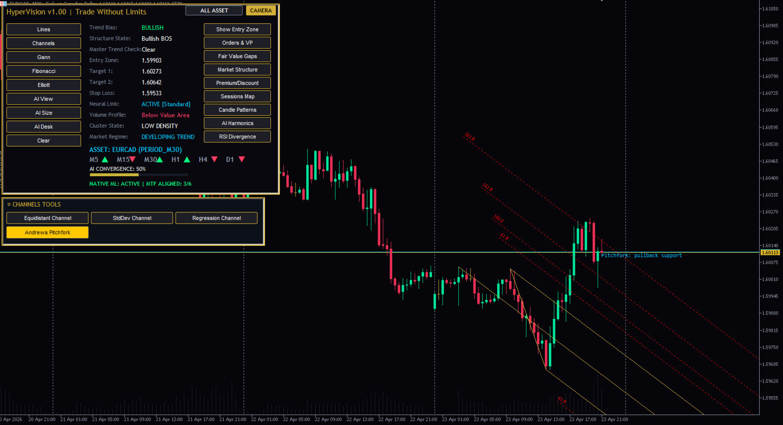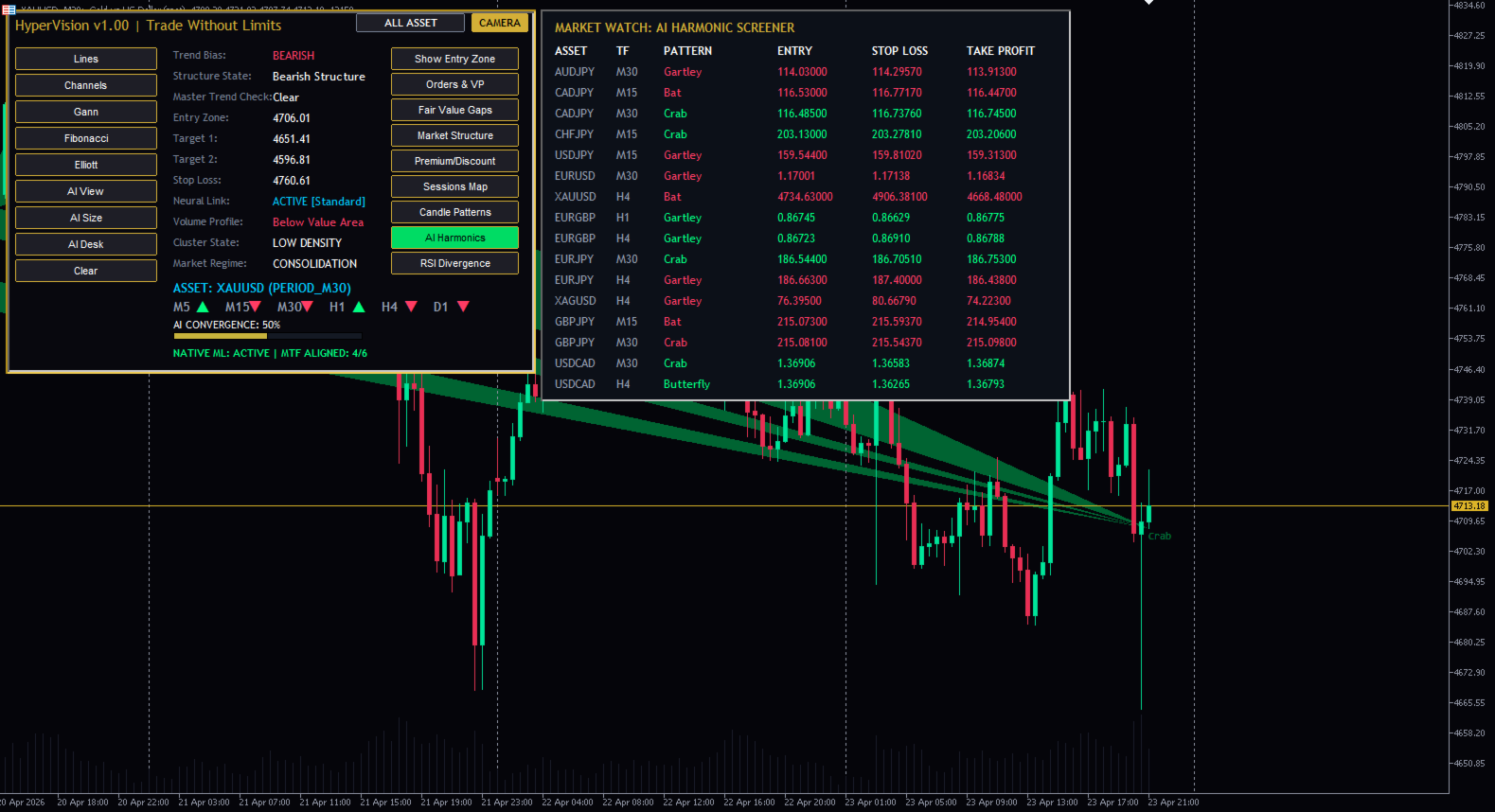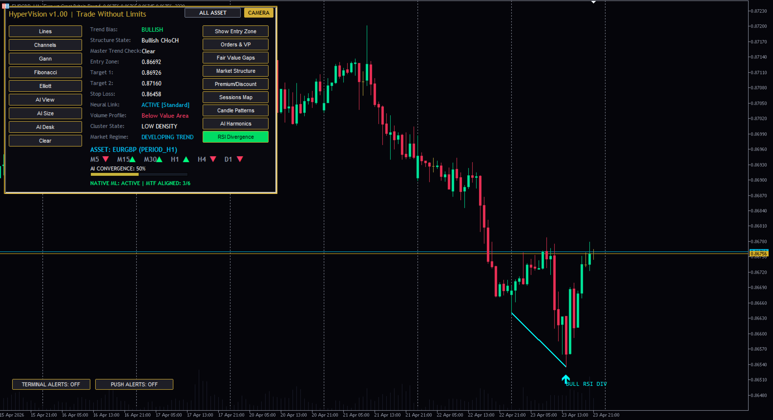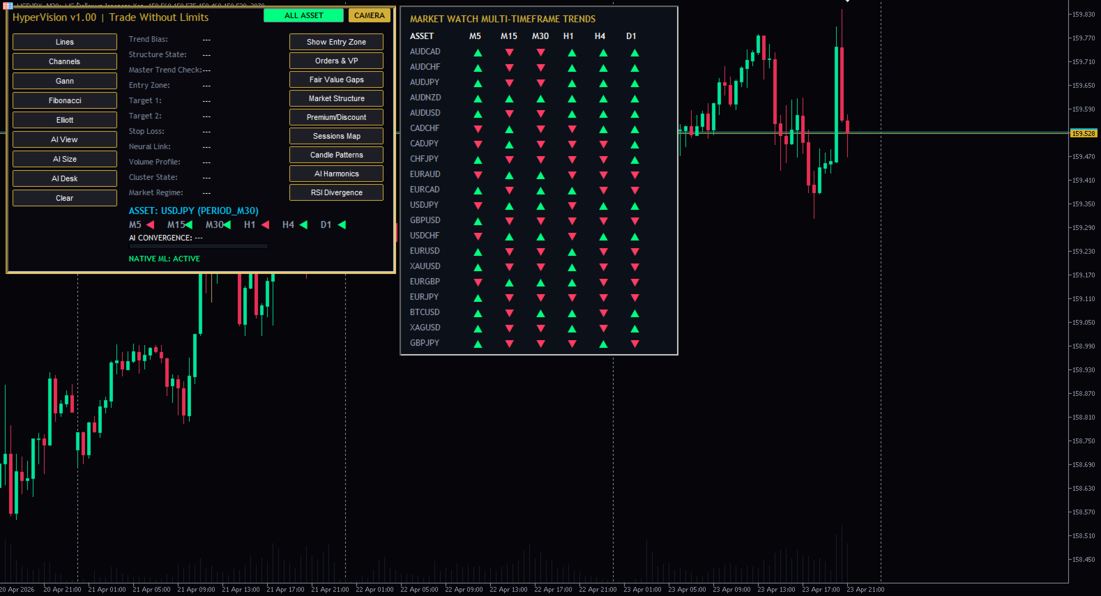 HyperVision AI 스마트 머니 지표 – SMC, 주문 블록, FVG, BOS 트레이딩 도구 (MT5) MetaTrader 5용 고급 스마트 머니 개념(SMC) 지표입니다. 시장 구조, 주문 블록, 높은 확률의 거래 영역을 정확하게 감지합니다. 기관 투자자처럼 거래하세요 – 개인 투자자처럼 거래하지 마세요 대부분의 트레이더는 시장의 실제 움직임을 제대로 이해하지 못해 실패합니다. HyperVision AI는 기관 투자자들이 사용하는 것과 동일한 원칙인 스마트 머니 개념(SMC)을 기반으로 구축되었습니다. HyperVision AI란 무엇인가요? HyperVision AI는 MT5용 강력한 올인원 트레이딩 지표로 다음과 같은 기능을 제공합니다. 시장 구조(추세 방향) 파악 구조 돌파(BOS) 및 CHoCH 감지 주문 블록(OB) 위치 파악 적정 가치 갭(FVG) 찾기 고확률 거래 영역 분석 주요 기능 스마트 머니 컨셉(SMC) 엔진 시장 구조 감지(BOS/CHoCH) 주문 블록 식별 적정 가치 갭(FVG) 영역 다중 시간 프레임 분석(HTF 바이어스) 거래량 프로파일(POC 및 가치 영역) 세션 기반 시장 분석 거래 영역 식별 실시간 알림 HyperVision AI를 선택해야 하는 이유 여러 전략을 하나의 도구로 통합 거래 시 추측을 배제합니다 기관 투자자 수준의 논리로 거래할 수 있도록 도와줍니다 외환, 금, 지수, 암호화폐에 적용 가능 초보 및 숙련된 트레이더 모두에게 적합 사용 방법 구조를 이용하여 시장 추세를 파악합니다 BOS 또는 CHoCH 확인을 기다립니다 주문 블록 또는 FVG 진입 시점을 확인합니다 적절한 위험 관리를 통해 거래를 시작합니다 최적 시간대 M15, M30, H1 (권장) 모든 시간대에서 사용 가능 중요 사항 이 지표는 자동 거래를 실행하지 않습니다. 분석 및 거래 인사이트를 제공하며, 사용자는 스스로 위험 관리를 해야 합니다. 최적의 사용자층 스마트 머니 트레이더 가격 움직임 트레이더 단기 트레이더 스윙 트레이더 금(XAUUSD) 및 외환 트레이더 기관 투자 전략 스마트 머니 컨셉 수록 올인원 트레이딩 시스템 고급 시장 구조 분석 고확률 거래 영역 MT5용 스마트 머니 컨셉 지표 MetaTrader 5용 오더 블록 지표 금 거래에 최적화된 MT5 지표 SMC MetaTrader 5 지표 MT5 지표, MetaTrader 5 지표, 스마트 머니 컨셉 지표, SMC MT5 지표, 오더 블록 MT5 지표, 적정 가치 갭 지표, BOSCCH 지표, 외환 거래 지표, 금 거래 지표, XAUUSD 지표, 가격 움직임 지표, 기관 투자 전략, MT5 도구, 최고의 MT5 지표 MT5 지표, 외환, 금, XAUUSD, 스마트머니, SMC, 주문 블록, FVG, BOS, CHOCH, 가격 움직임, 거래 도구, 기술적 분석, 일중 거래, 스캘핑, 다중 시간 프레임