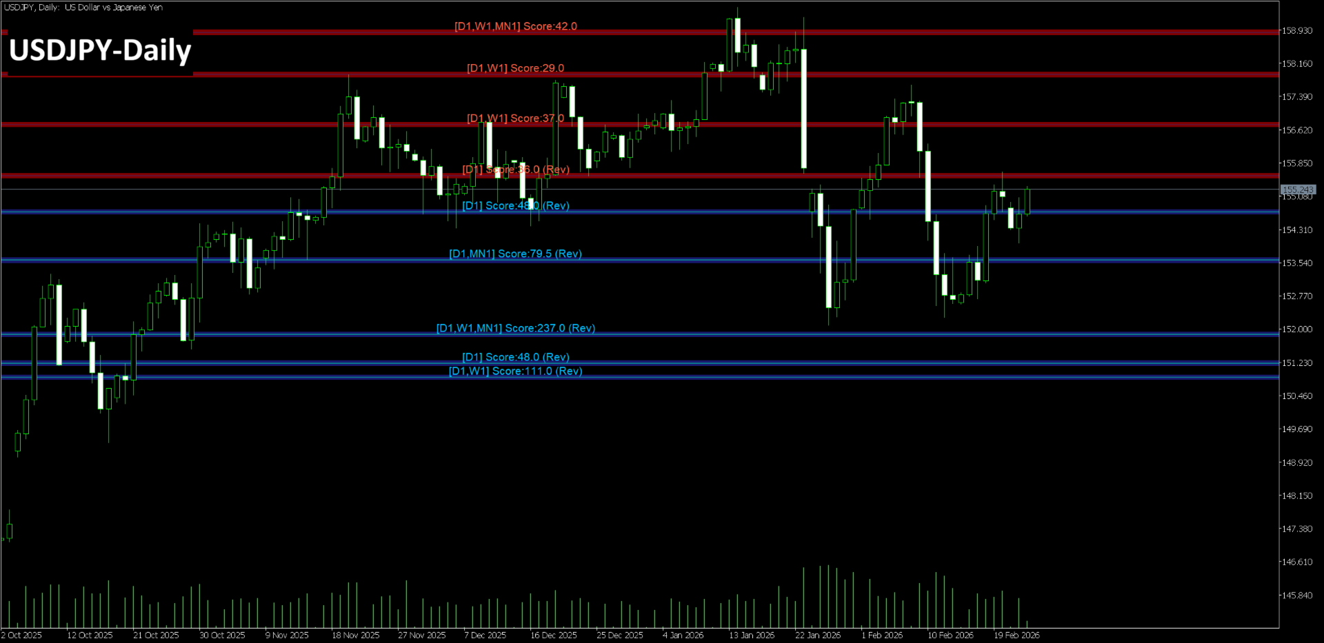Each level is displayed with a score calculated based on the types of timeframes involved and the frequency of historical reversals.