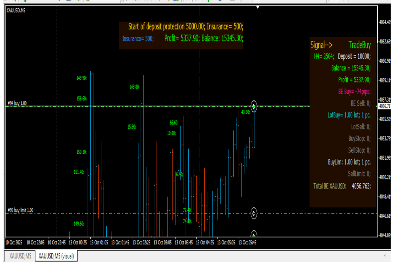 В режиме автоматической торговли новые позиции будут открываться в соответствии с торговыми сигналами встроенного визуального индикатора. Эти сигналы обозначаются как Signal ---> TradeBuy для покупки и Signal ---> TradeSell для продажи, если Signal ---> NULL, то новые позиции не открываются. Важно учитывать величину кредитного плеча, так как она влияет на размер лота при автоторговле. Рекомендуется использовать плечо не более 1:200.