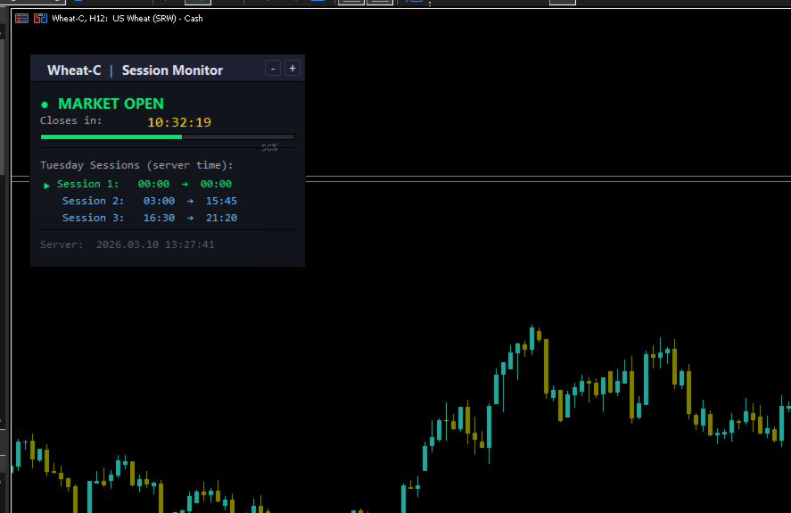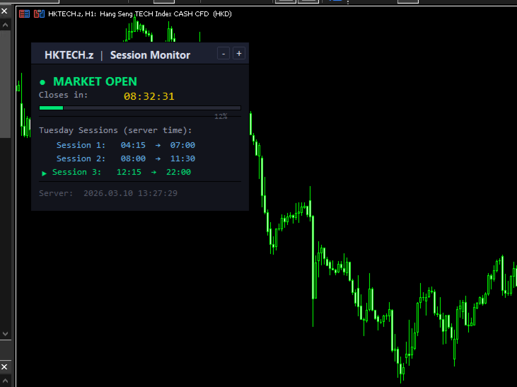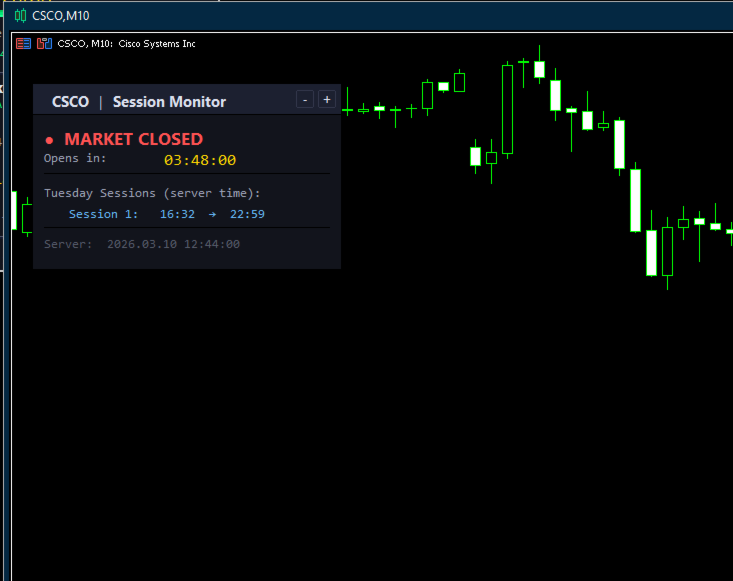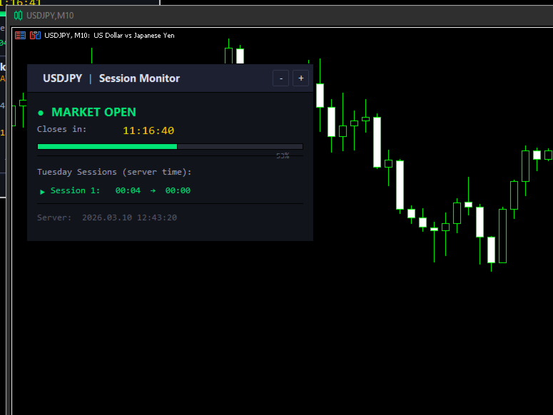 Nika Session Spread Intelligence는 시장 개장 시간, 마감까지 남은 시간, 모든 거래 세션을 깔끔한 다크 테마 패널로 차트에 직접 표시하는 경량 인디케이터입니다. 일반적인 세션 인디케이터와 달리 이 도구는 SymbolInfoSessionTrade를 통해 브로커의 실제 거래 세션 일정을 읽어오므로 표시 시간이 항상 정확합니다 - 외환, 지수, 원자재, 암호화폐 모두 지원. 주요 기능 - 시장 개장/폐장 상태 색상 표시 (녹색 = 개장, 빨간색 = 폐장) - 카운트다운 타이머 - 세션 종료 또는 다음 개장까지 남은 시간, 500ms마다 업데이트 - 시각적 진행 바 - 세션 진행에 따라 채워짐, 마감 근처에서 오렌지색으로 변경 - 당일 모든 세션 목록 (서버 시간), 활성 세션 강조 표시 - 내장 알림 - 세션 시작/종료 X분 전 알림 (설정 가능, 사운드 포함) - 패널의 + / - 버튼으로 확대/축소 - 완전한 사용자 정의 - 색상, 폰트, 위치, 새로고침 빈도, 배율을 입력 파라미터로 설정 - 모든 심볼 지원 - 심볼 지정 또는 비워두면 현재 차트 사용 파라미터 개요 - Symbol - 비워두면 현재 차트 심볼 사용 - X / Y Position - 화면에서의 패널 위치 - Colors - 각 UI 요소의 색상 제어 - Font / Font Size - 고정폭 폰트 (기본값 Consolas) - Refresh Rate - 업데이트 간격 (기본값 500ms) - Alert Before Open/Close - 세션 이벤트 N분 전 알림 - Alert Sound - 터미널 Sounds 폴더의 WAV 파일 - Scale Min/Max/Step - 패널 확대/축소 범위 참고 사항 - 모든 차트에 설치 가능. MT5 내장 객체만 사용 - DLL 없음, 외부 호출 없음. - 서버 시간이 패널 하단에 표시됨. - 자정을 넘는 세션도 올바르게 처리. - 오늘 세션이 없는 경우 (예: 주말), 다음 개장까지의 카운트다운 표시. 무료. 제한 없음.