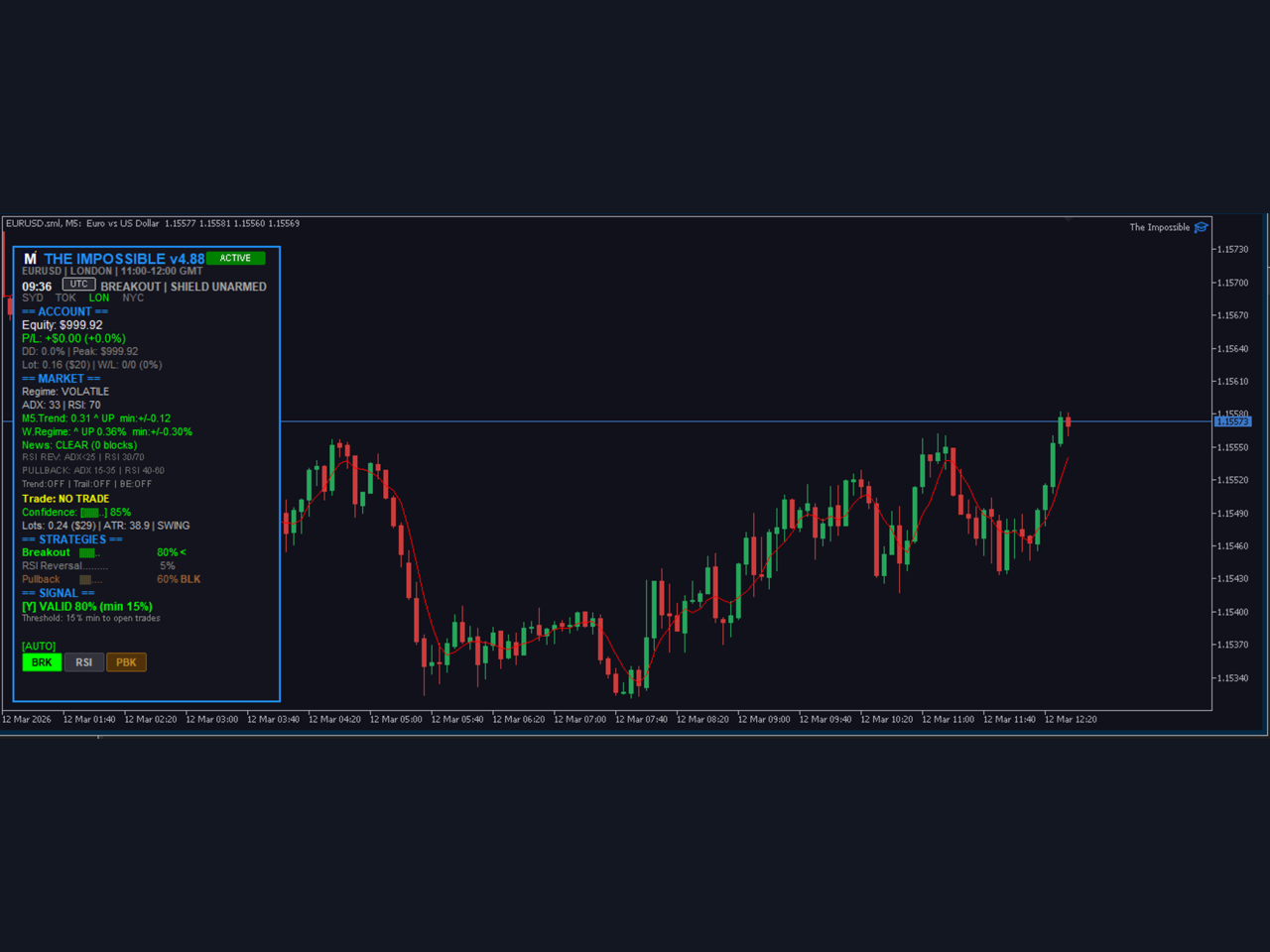 🔄 Adaptive, Not Static Most EAs run one strategy that works in one market condition. The Impossible EA scores three strategies in real time and switches to the one that fits the current market. Trending? Pullback activates. Ranging? RSI steps in. Breakout forming? BO takes over. | 📡 Verified Live Signal No hidden backtests or theoretical results. The EA runs live on a real account, fully tracked on MQL5 Signals. Verified by MQL5 servers — what you see is what you get. No demo trickery, no curve-fitting magic. |