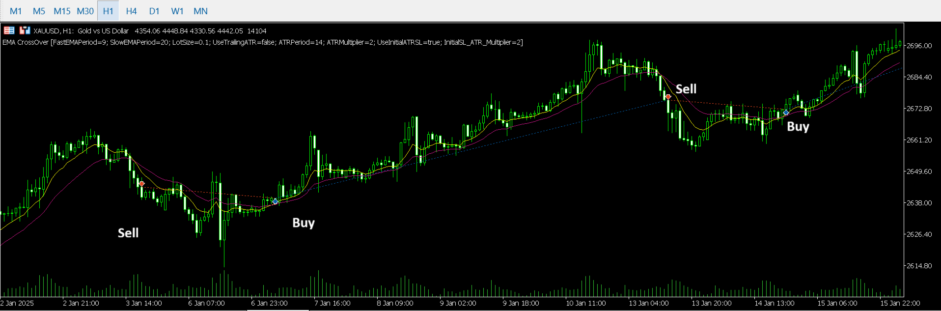 EA는 빠른 EMA가 느린 EMA를 상향 돌파하고 확인 캔들이 일간 VWAP 위에서 마감할 때 매수 포지션을 엽니다. 마찬가지로 빠른 EMA가 느린 EMA를 하향 돌파하고 확인 캔들이 일간 VWAP 아래에서 마감할 때 매도 포지션을 엽니다. 새로운 거래를 열기 전에 시스템은 동일 심볼의 반대 포지션을 닫아, 거래 로직이 깔끔하고 최신 신호와 일치하도록 유지합니다.