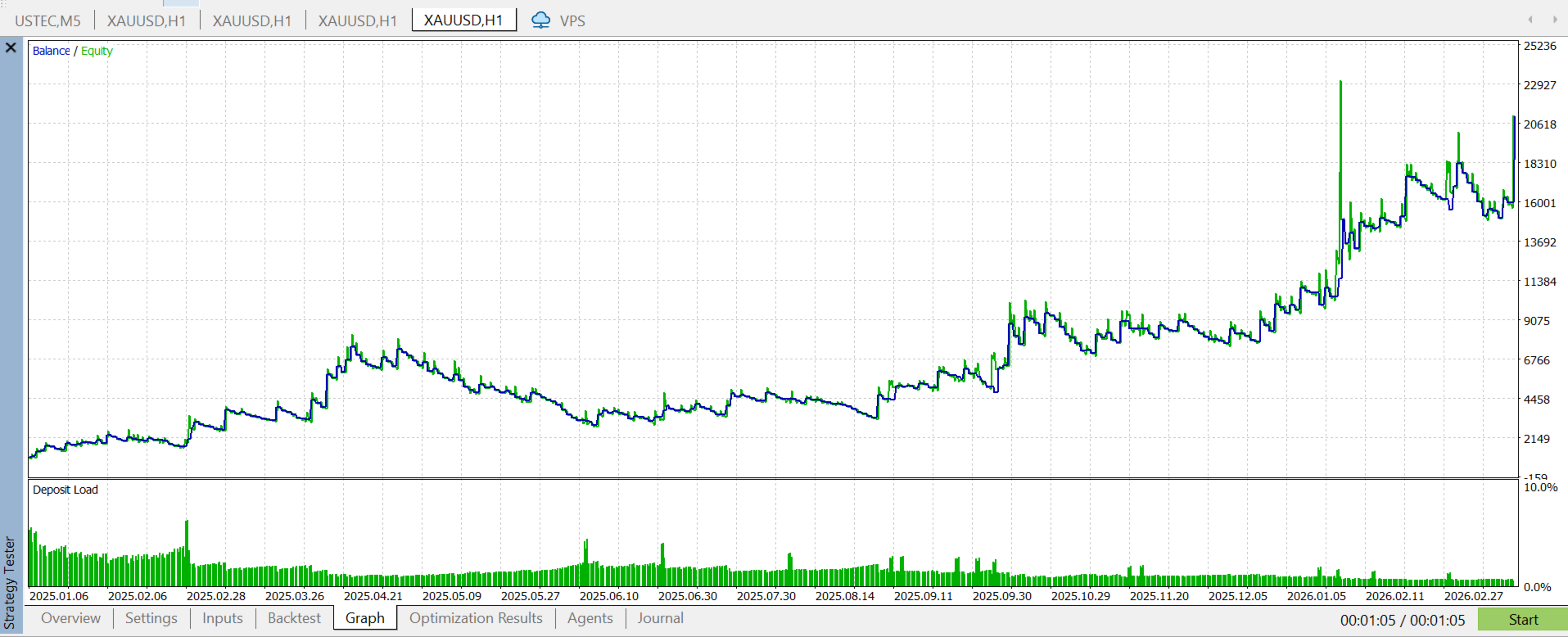 첨부된 백테스트에서 이 설정은 99% 히스토리 품질로 평가되었습니다. 모든 최적화와 마찬가지로, 이러한 결과는 특정 시장 환경(backtest)에 속하는 것이며 미래 성과를 보장하는 약속이 아니라 기술적 참고 자료로 보아야 합니다.