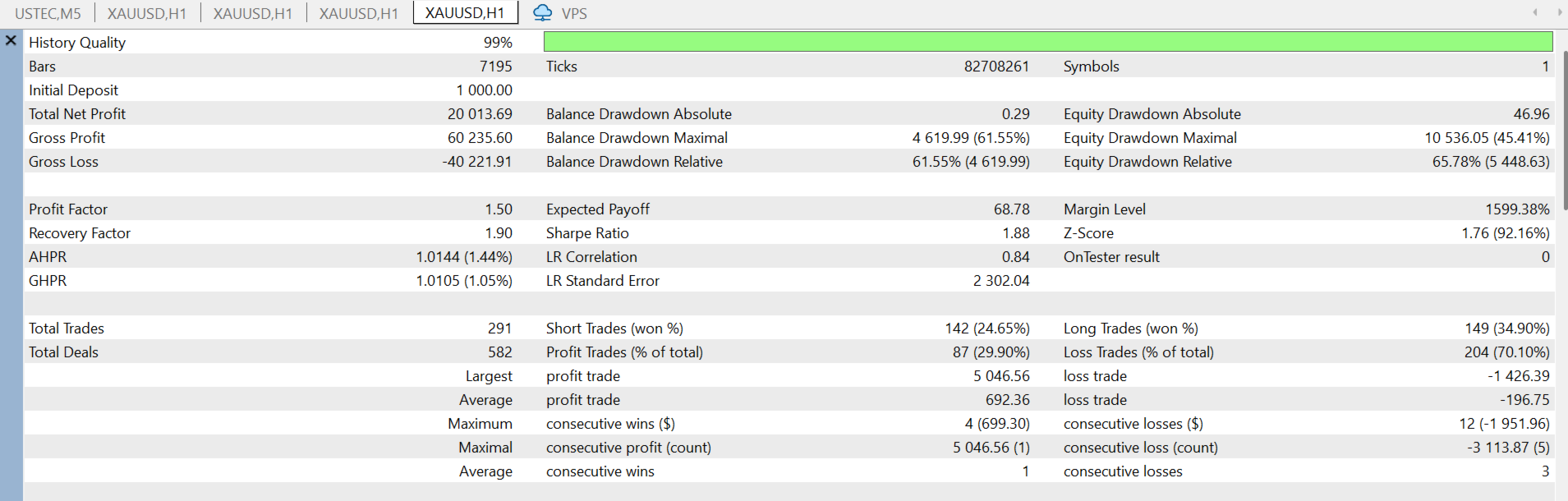 첨부된 결과는 XAUUSD 1시간 차트에서 최적화된 설정으로 얻은 것입니다. EA는 어떤 통화쌍이나 심볼에도 사용할 수 있지만, 아래 설정은 해당 최적화에 특화된 값입니다.