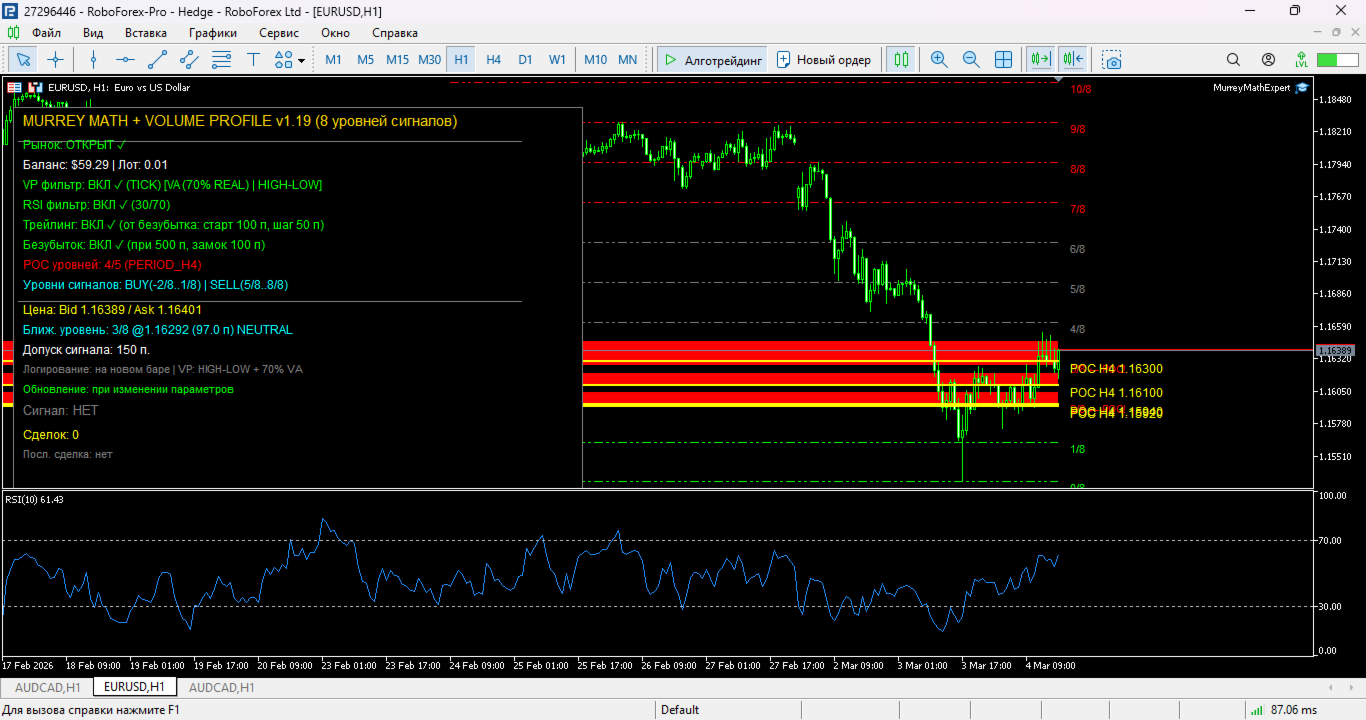 The trading advisor implements a Murray Points trading strategy with additional signal filtering based on Volume Profile and Relative Strength Index (RSI) analysis. The system is designed for the Forex market and is focused on trading during flat and corrective movements.