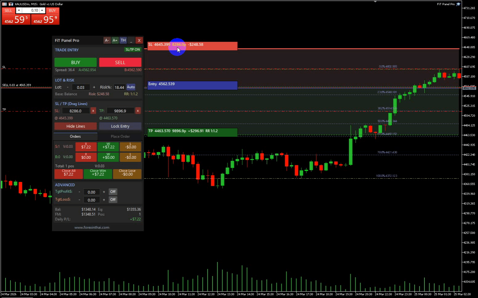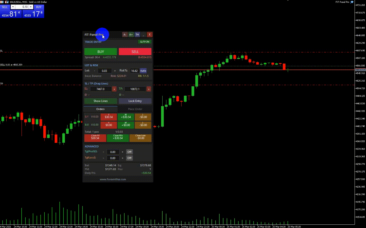 FiT Panel Pro is a professional-grade trade management panel designed for MetaTrader 5 traders who demand speed, precision, and full control over their trades. Built with a modern dark-theme UI, it combines one-click execution with advanced risk management, visual SL/TP drag lines, automatic Fibonacci-based levels, and comprehensive order management — all in a single, compact panel.