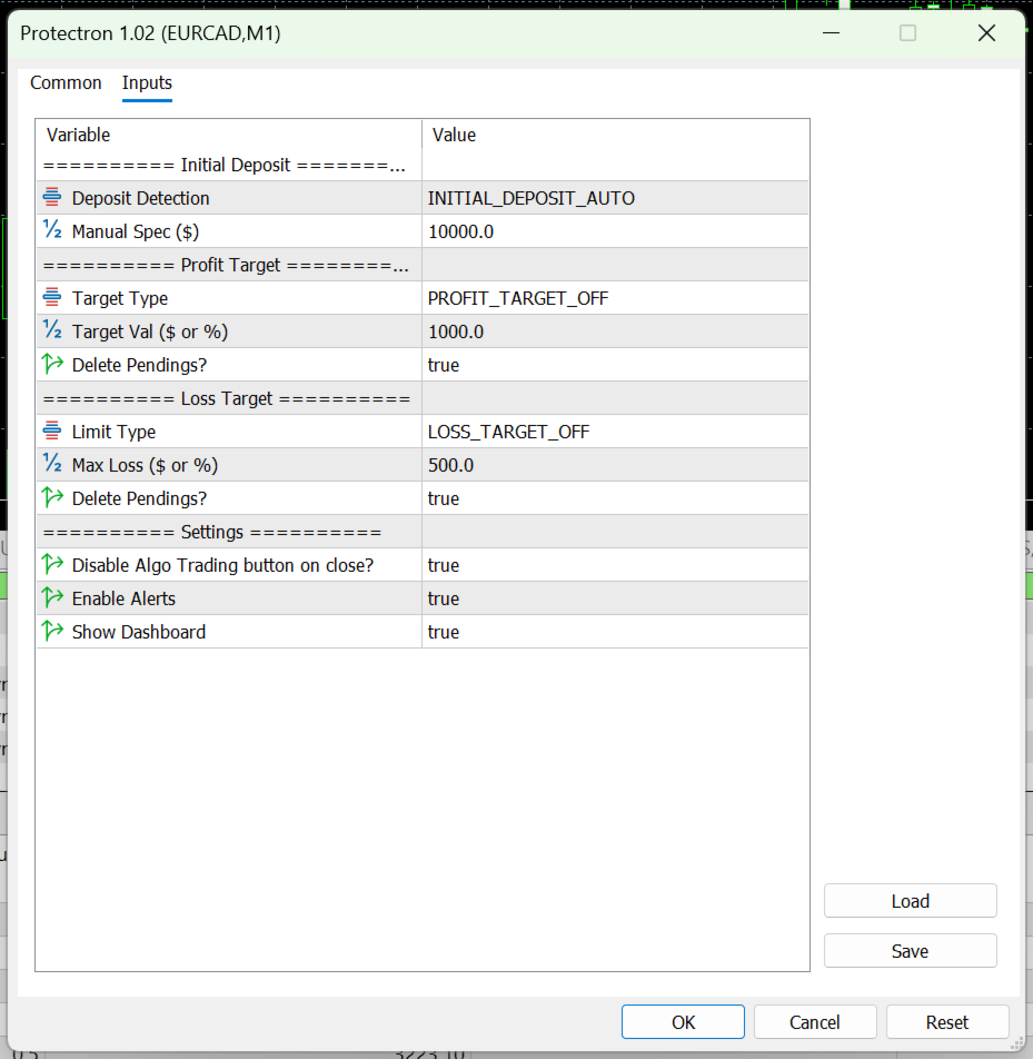 Protectron is a professional account protection system designed to automatically safeguard your trading capital by enforcing strict profit targets and loss limits. Whether you're trading manually, running other EAs, or managing multiple strategies, Protectron acts as your silent guardian—monitoring your account equity in real-time and executing protective actions when your defined thresholds are reached.