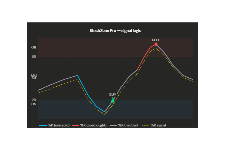 StochZone Pro takes the classic stochastic oscillator and adds a layer of zone-based visual intelligence. Instead of reading numbers, the %K line changes color in real time: blue when the price is oversold, red when overbought, and gray when neutral — giving you instant context at a glance.