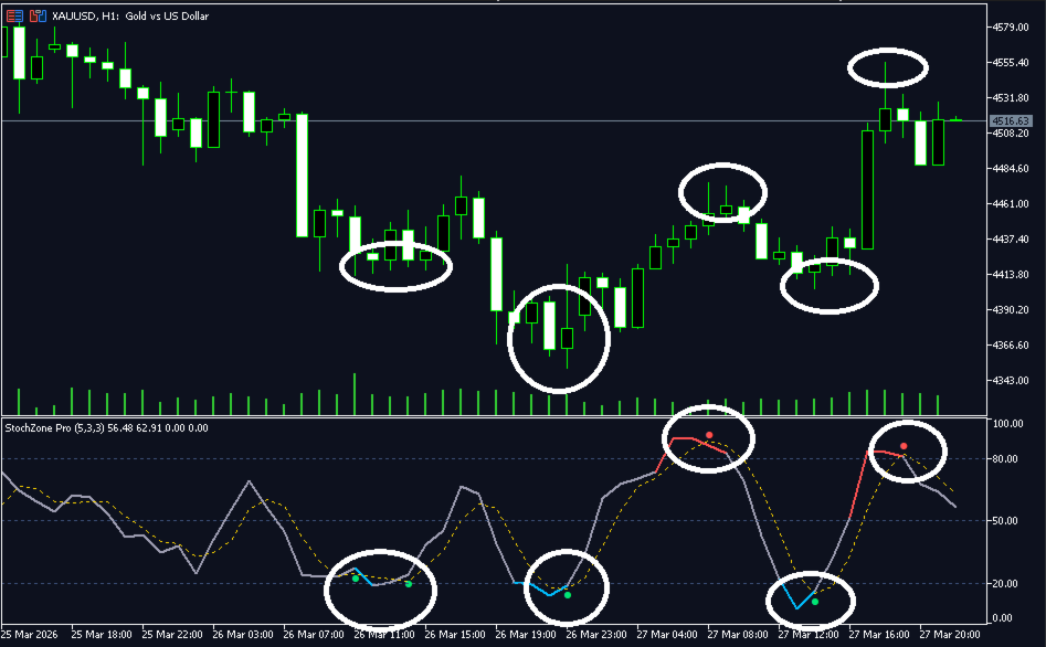 What sets it apart: The colored %K line tells the story before the signal appears. You see momentum building in a zone, and when the crossover confirms it, the signal point appears exactly where the price action validates it — not in the middle of nowhere.