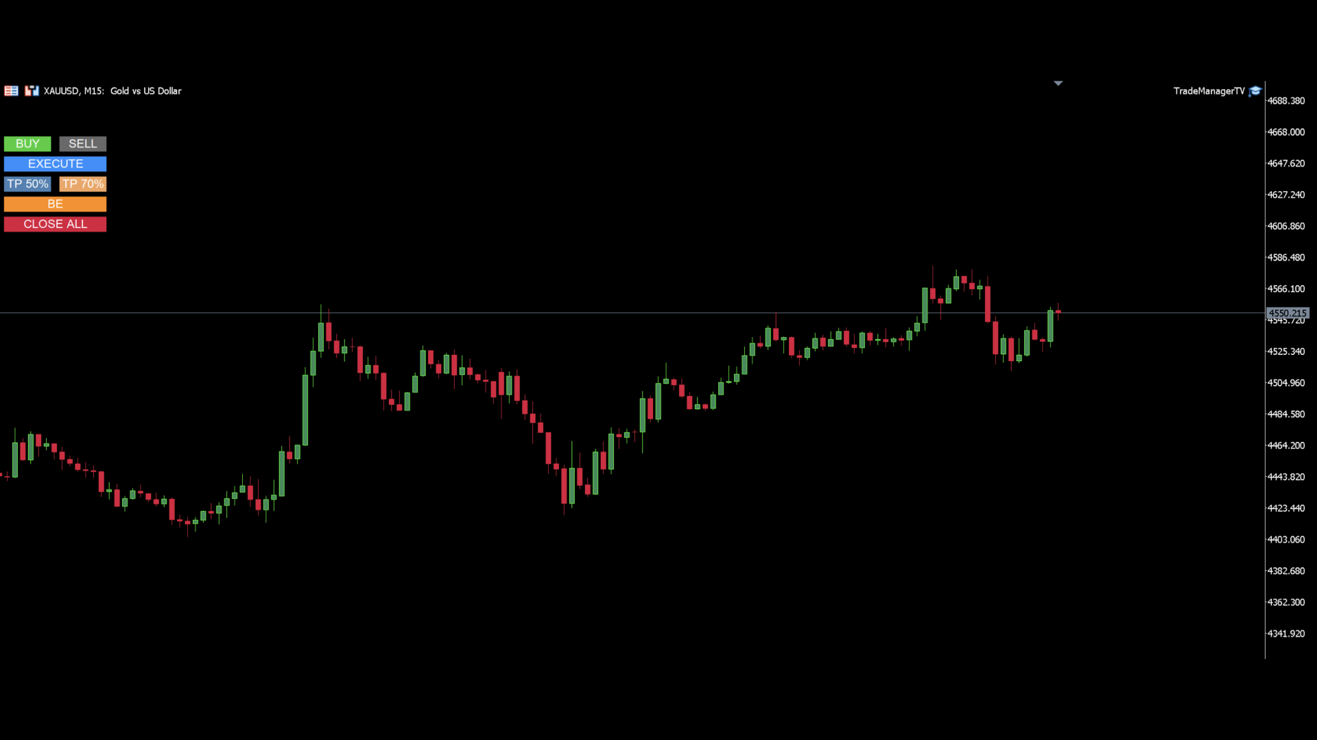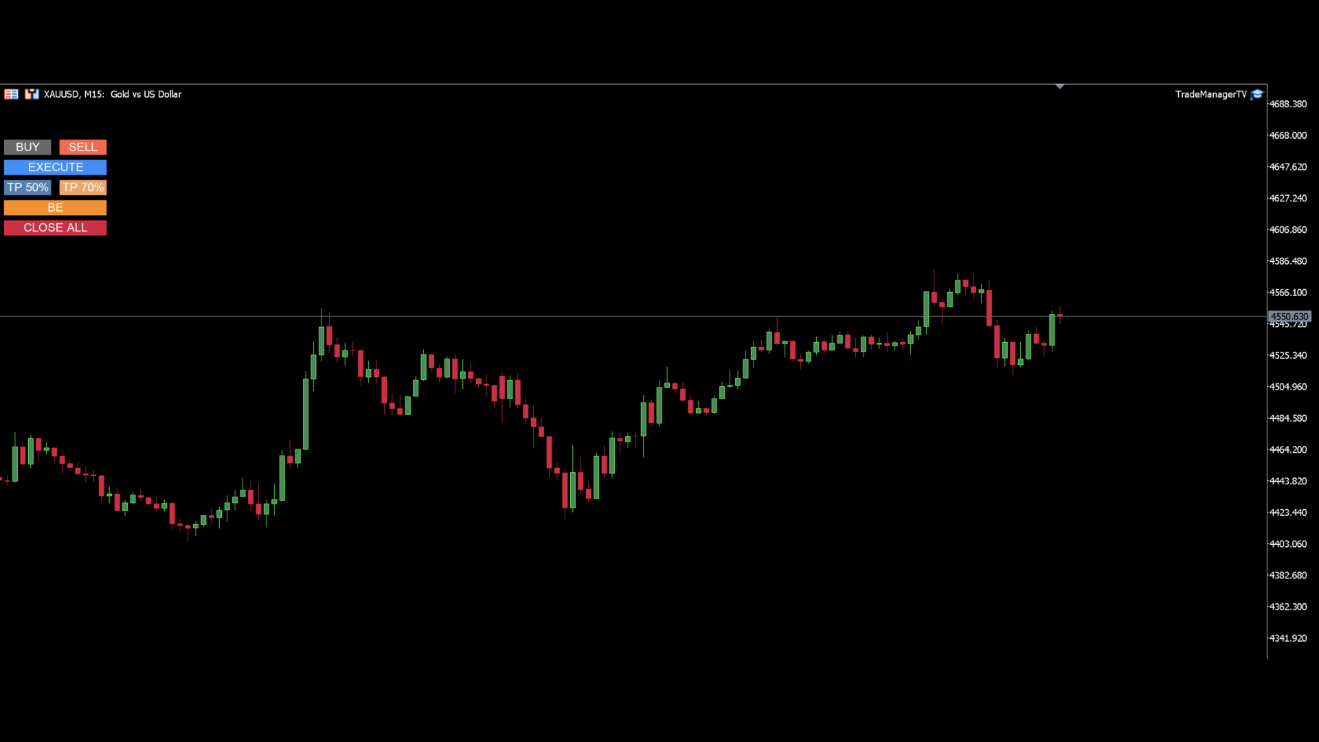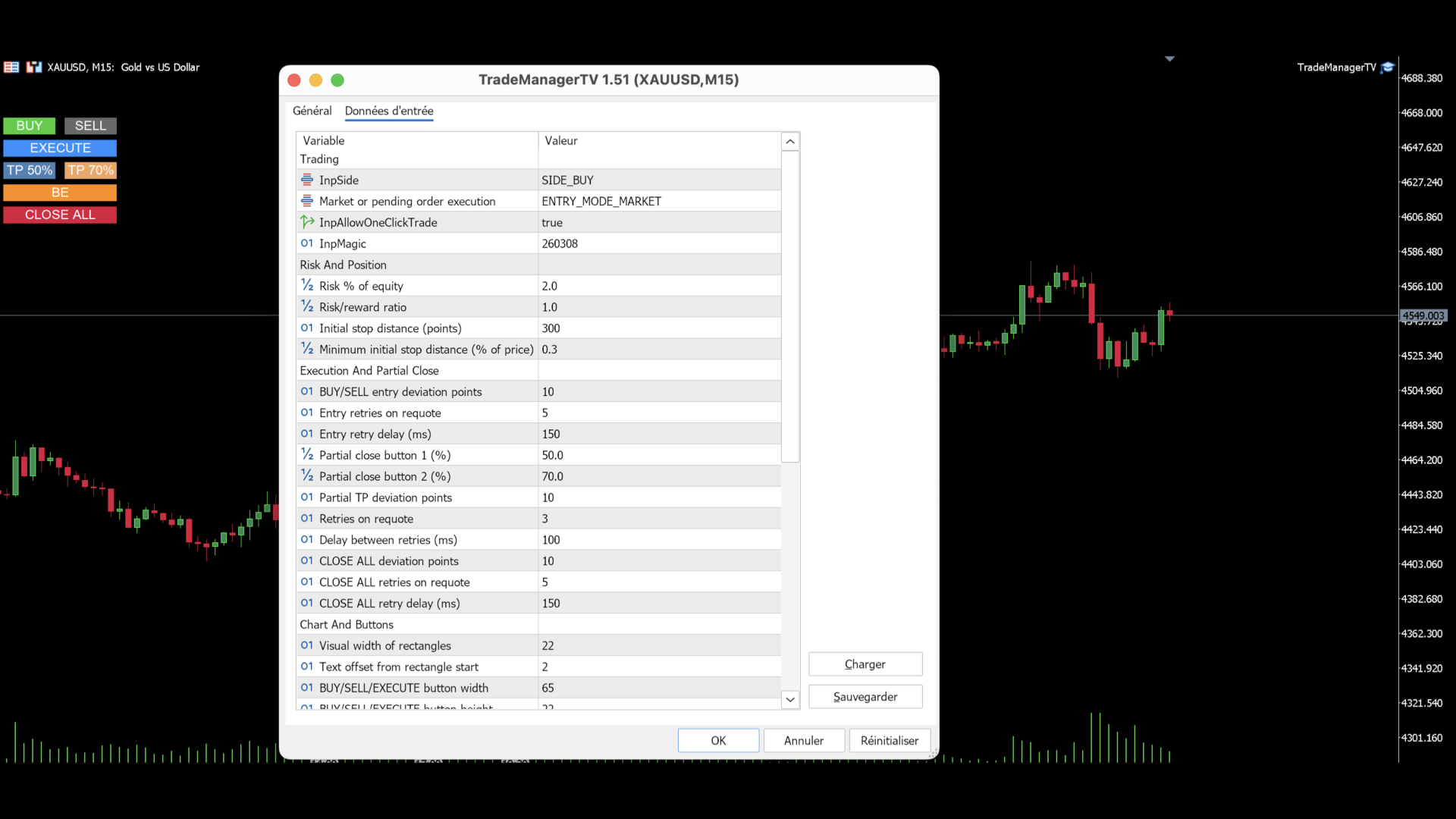 - Two partial take profit buttons with user-defined percentages