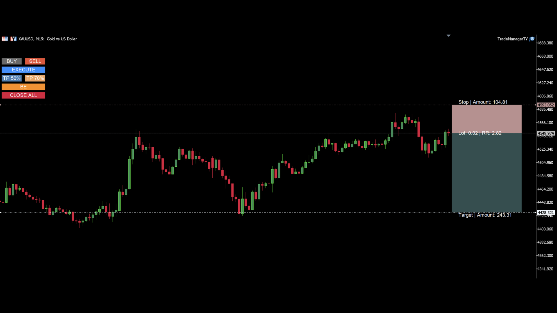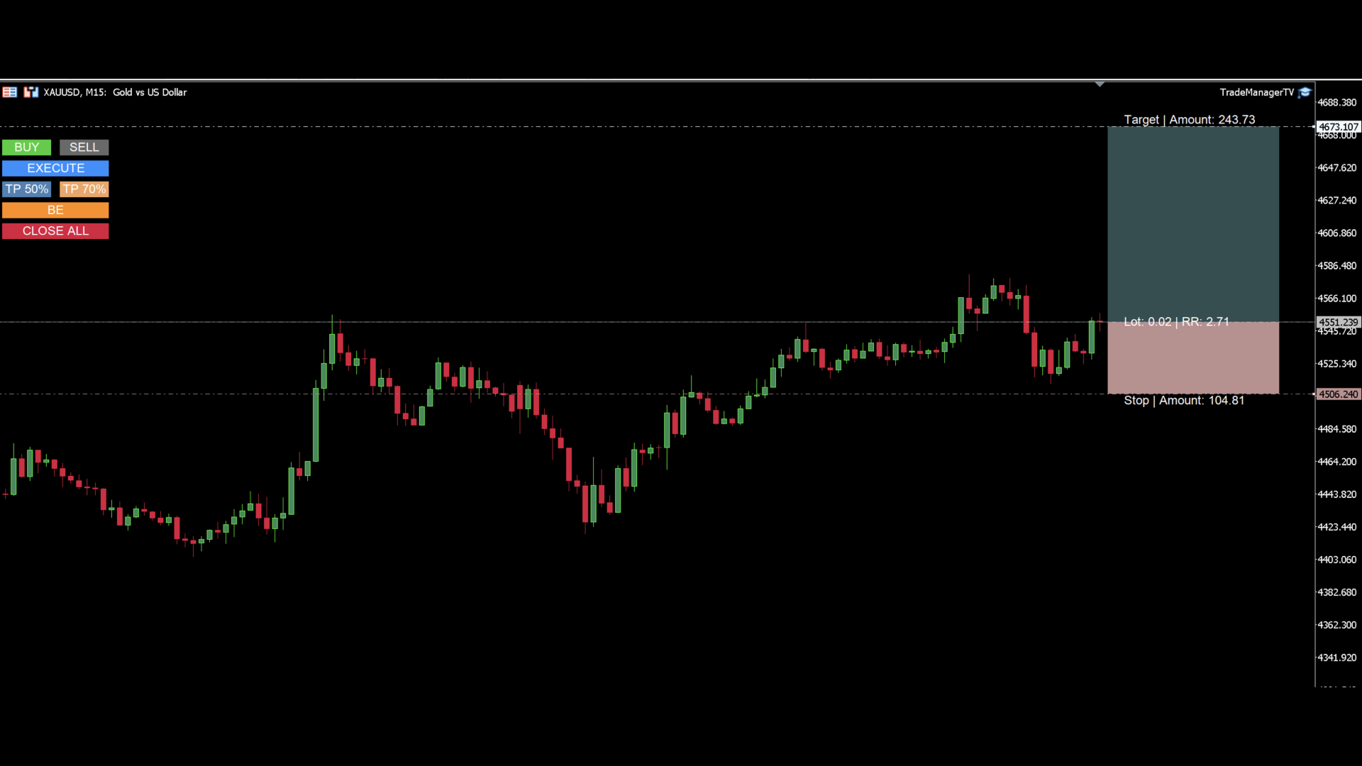 The panel provides a visual trade box with entry, stop and target lines directly on the chart. Position size is calculated from the selected risk percentage, and the tool supports both market execution and pending order placement.
