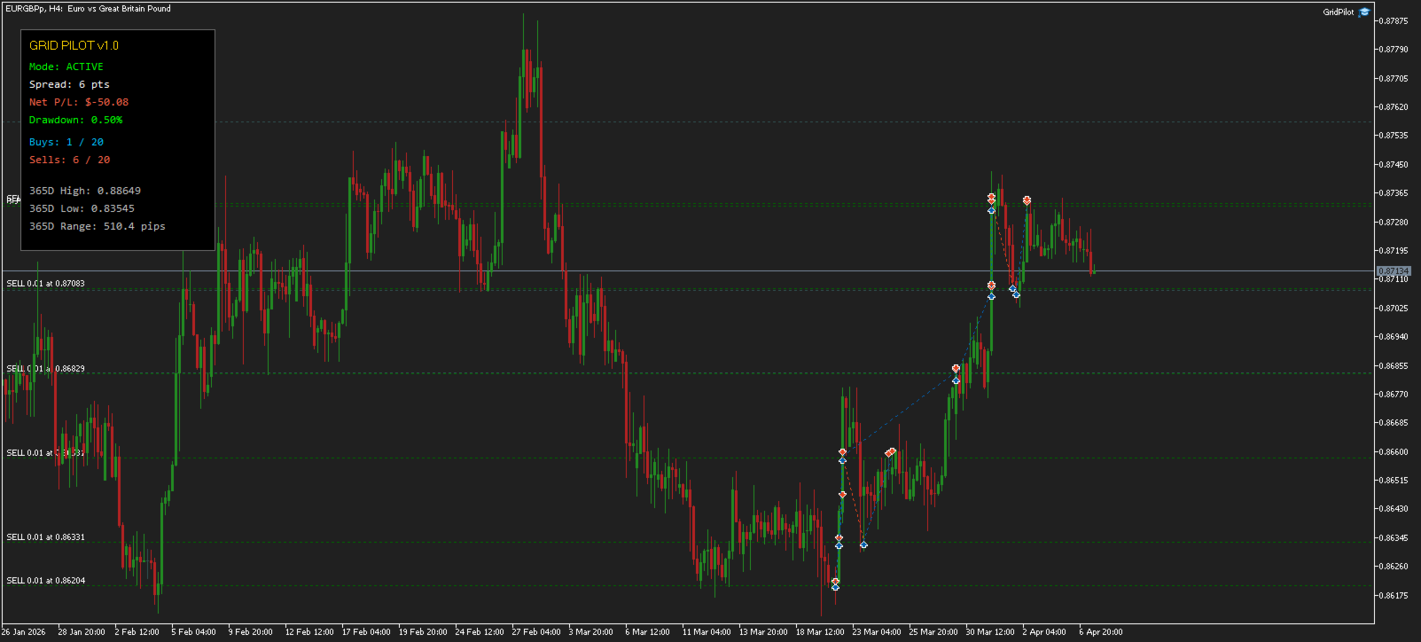 Whenever price moves away from the nearest grid order, GridPilot automatically replenishes the missing Buy or Sell position to maintain grid symmetry.