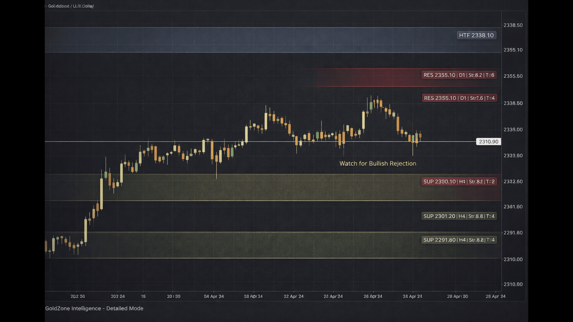 When price enters or closely approaches a strong zone, GoldZone Intelligence can optionally display a small contextual note directly on the chart. These notes describe the nature of the zone and what type of reaction to watch for, such as a bullish rejection at support, a bearish rejection at resistance, or a potential retest of a previously broken level.