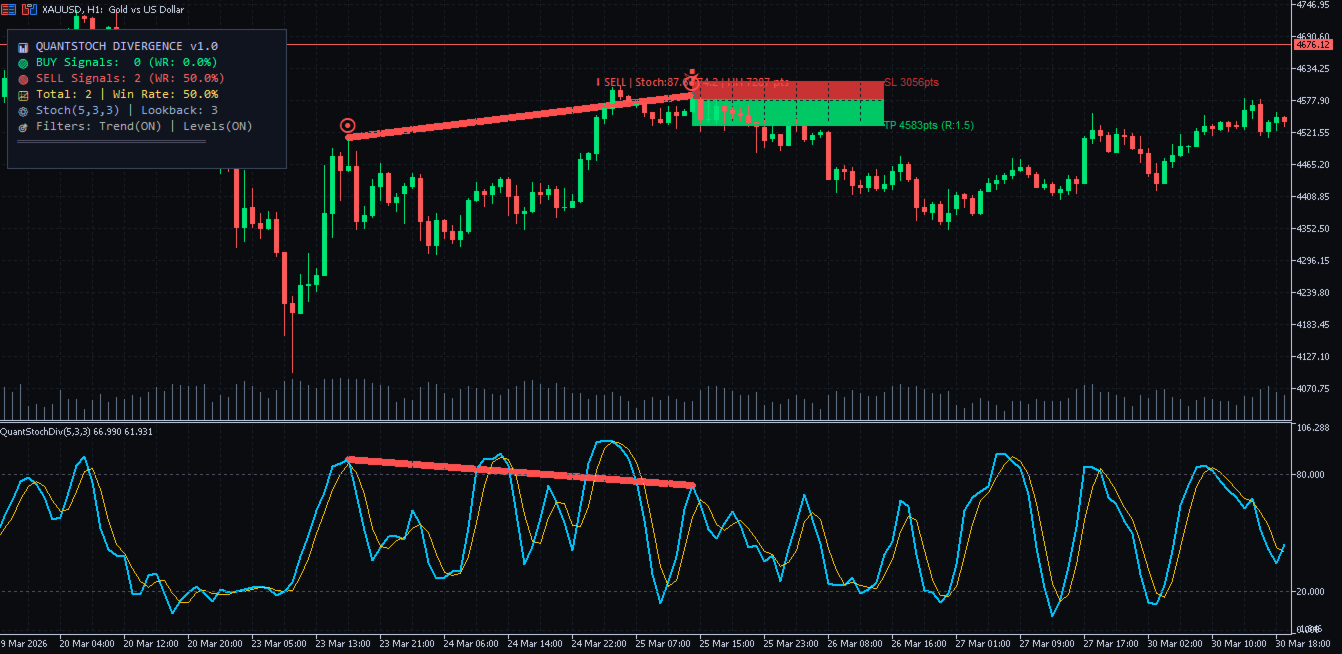 QuantStoch Divergence is an advanced indicator for MetaTrader 5 that detects regular and hidden divergences between price and the Stochastic Oscillator, providing complete trading signals with automatic risk management zones, real-time performance statistics, and a fully customizable visual system.