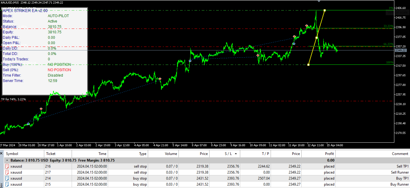 Apex Striker is a sophisticated EA that automates Fibonacci breakout trading on Gold, Forex and any Market. Whether you're a beginner looking for a "plug-and-play" solution or an advanced trader who wants full auto or manual control, this EA adapts to your trading style.