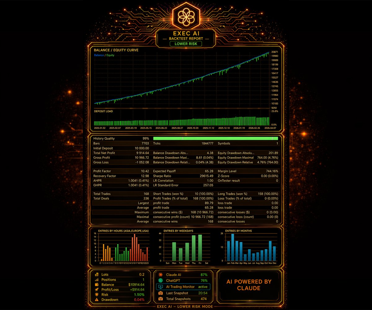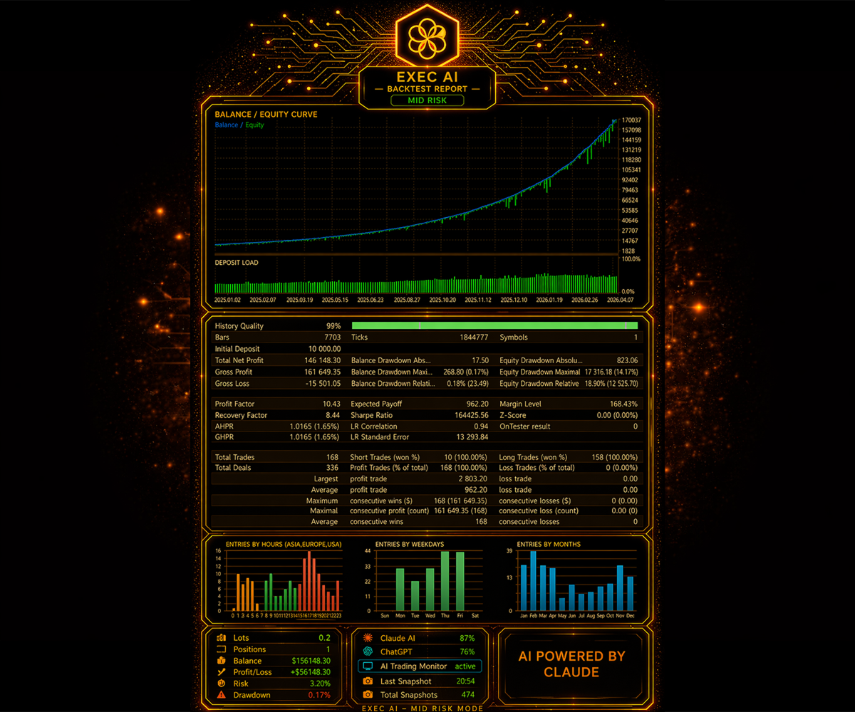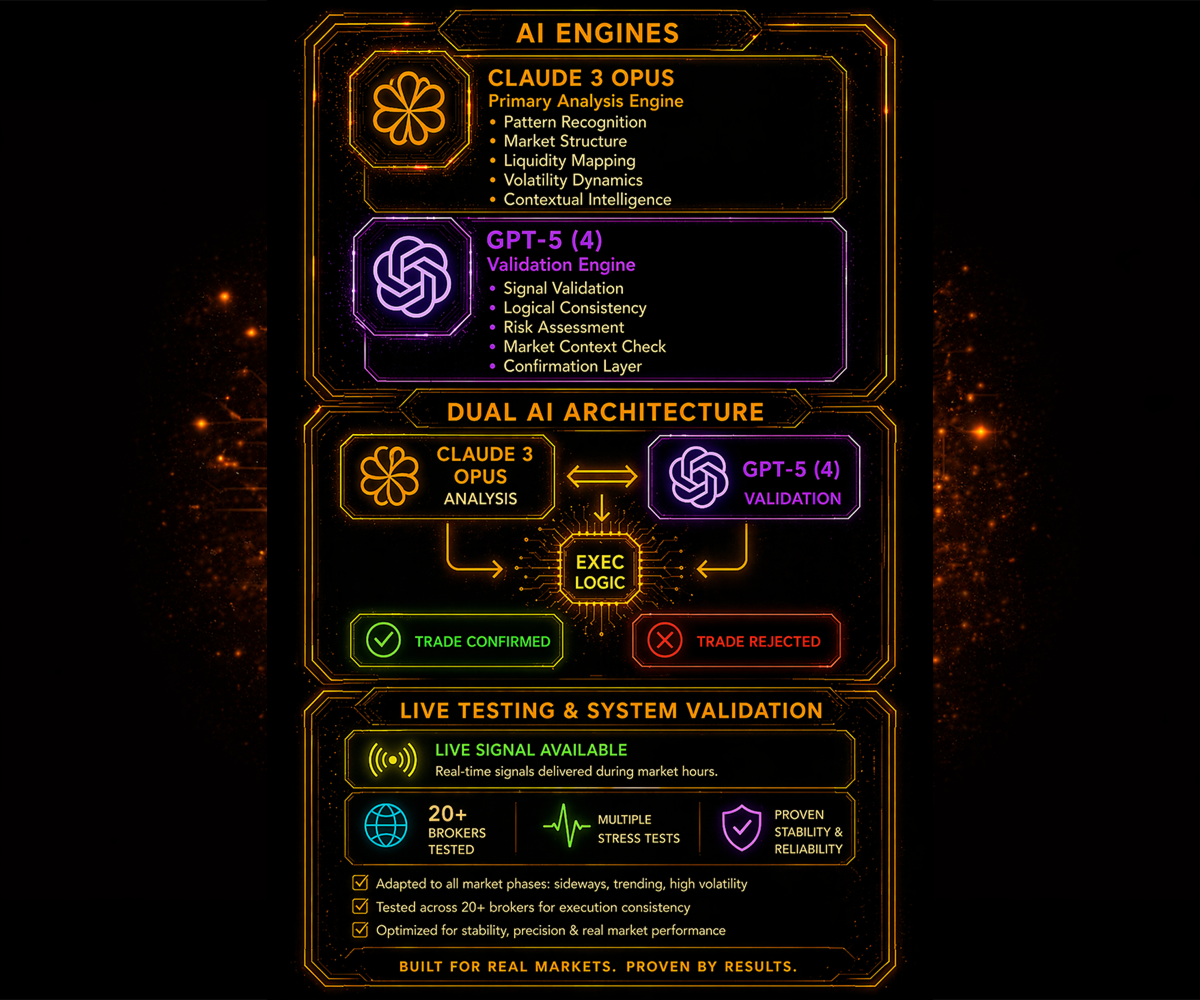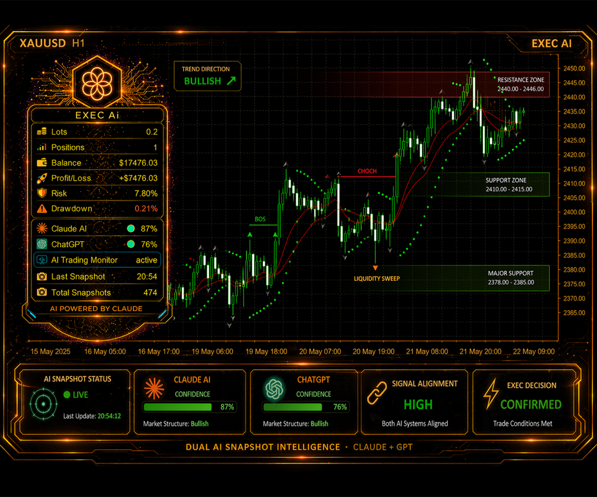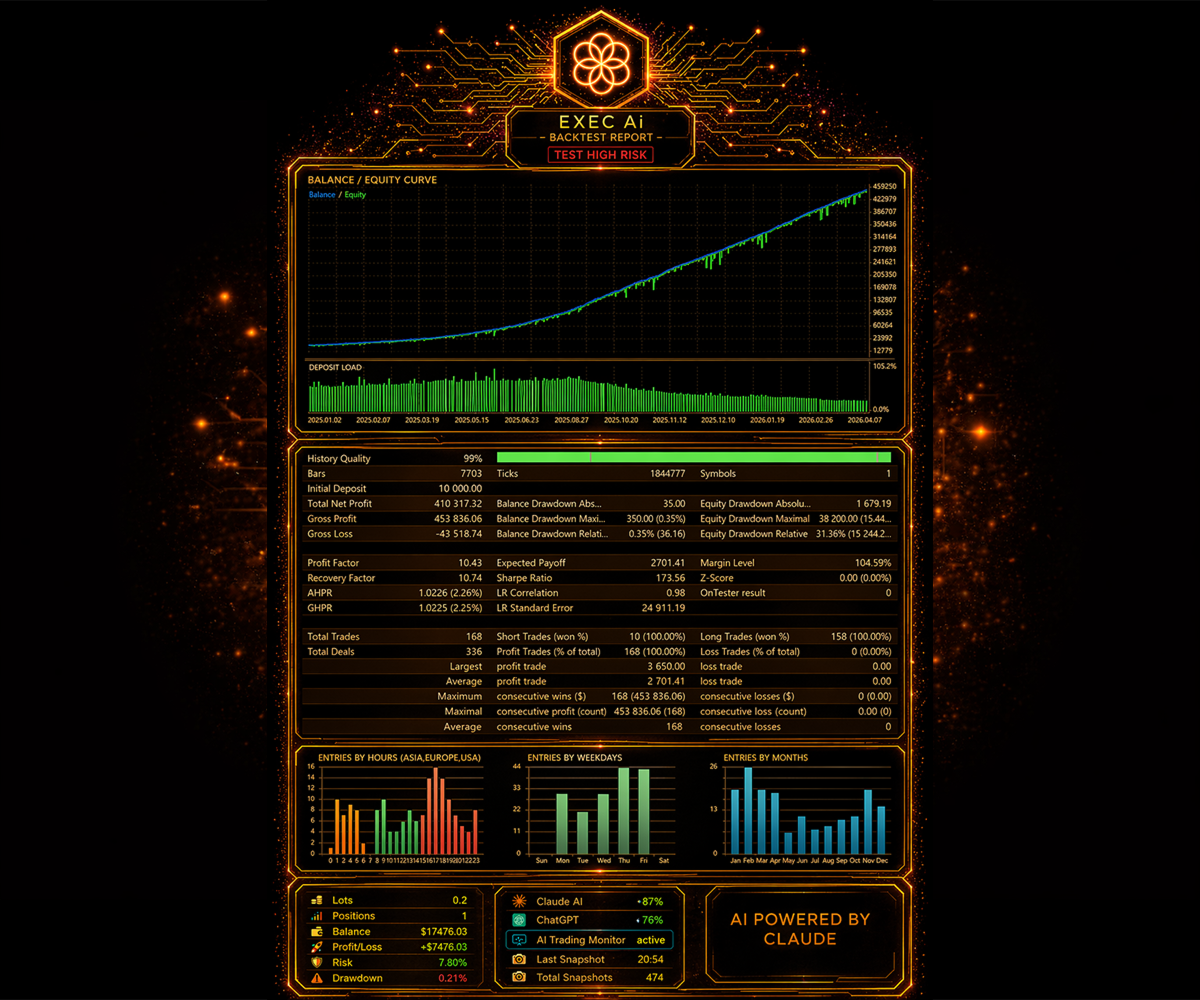 EA는 6개월 이상 라이브 트레이딩으로 운영되었으며, Claude와 GPT AI 모듈은 다양한 시장 단계에 적응할 수 있었습니다.