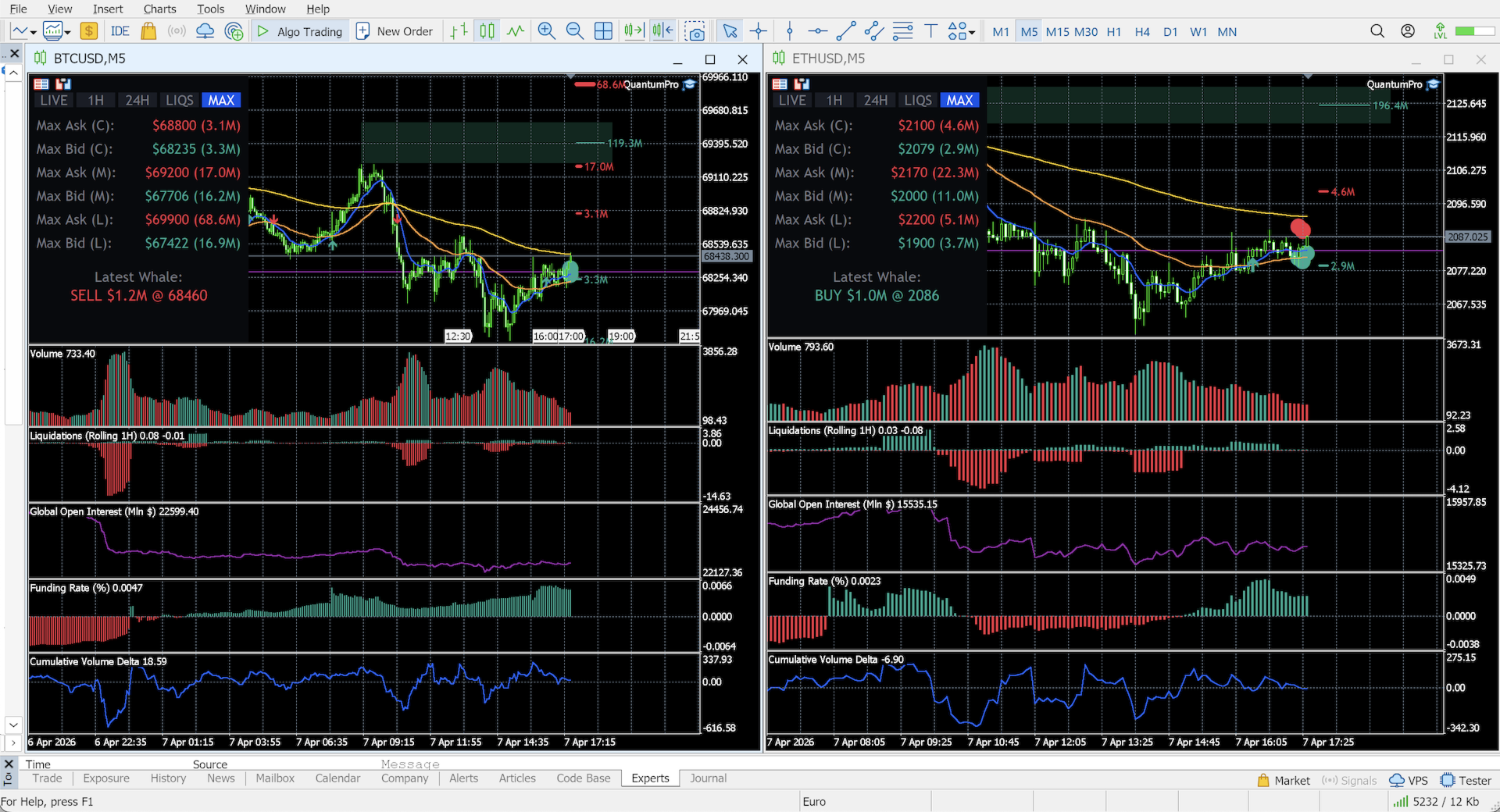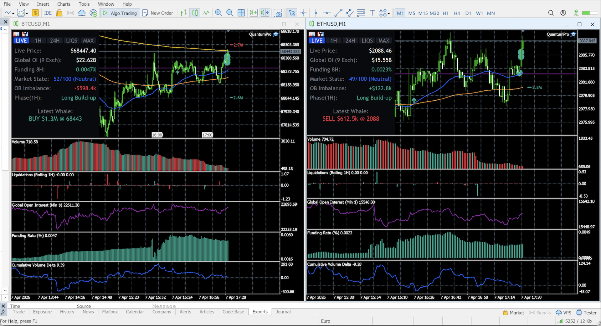 Quantum Terminal Pro (QTP) is a revolutionary SaaS-bridged utility that connects your MT5 terminal directly to a high-performance institutional data aggregator. It feeds perfectly synchronized, real-time data from 9 leading crypto exchanges (Binance, Bybit, OKX, Bitget, Deribit, Hyperliquid, HTX, Gate.io, and dYdX) straight to your broker's charts.