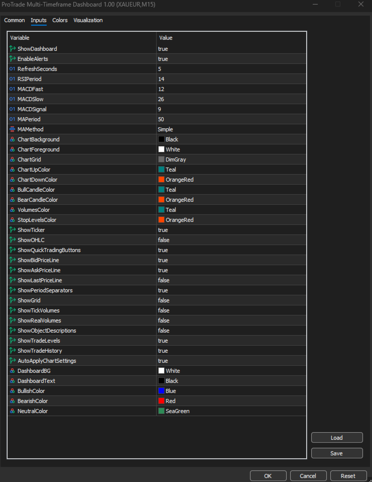 - ShowPeriodSeparators, ShowTradeLevels, ShowTradeHistory: 추가 차트 요소 전환