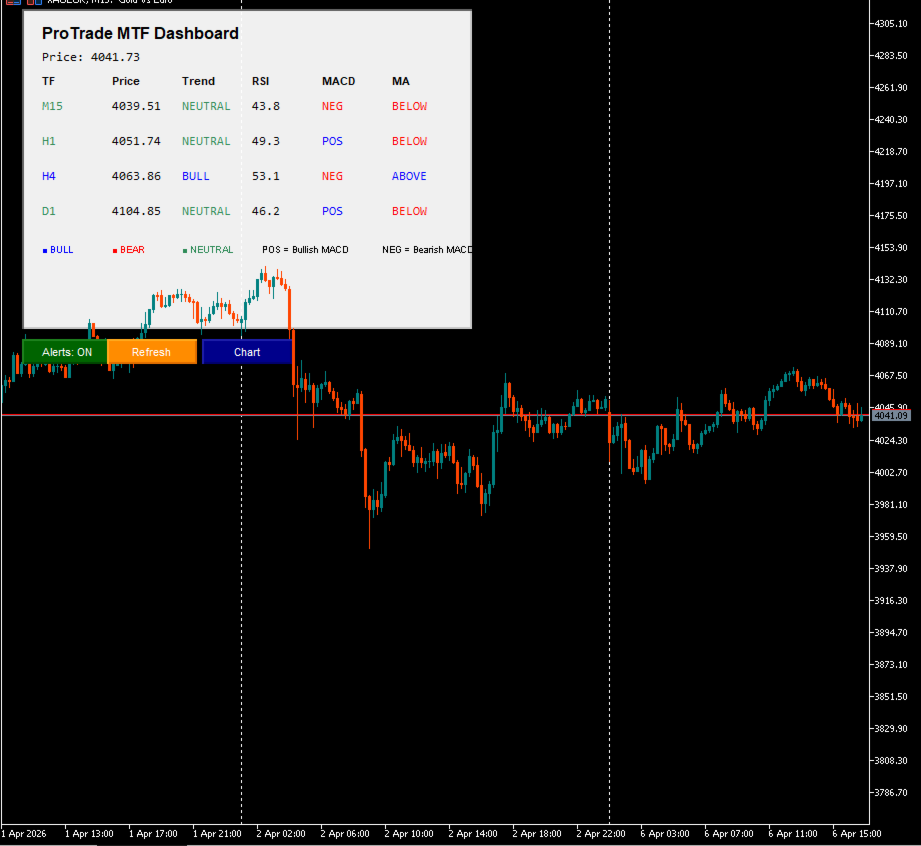 ProTrade Multi-Timeframe Dashboard 는 MetaTrader 5 용 전문 기술 분석 인디케이터로, 4 가지 주요 타임프레임 (M15, H1, H4, D1) 에 걸쳐 즉각적이고 한눈에 들어오는 트렌드 분석을 제공합니다. 각 타임프레임의 RSI, MACD 히스토그램 및 이동평균선 정렬 상태를 깔끔하고 색상 코딩된 대시보드에 표시함으로써, 본 인디케이터는 트레이더가 차트를 전환하거나 수동으로 정렬을 계산하지 않고도 멀티 타임프레임 컨플루언스 (공명) 를 통해 고확률의 트렌드 지속 및 잠재적 반전 구역을 식별하는 데 도움을 줍니다.