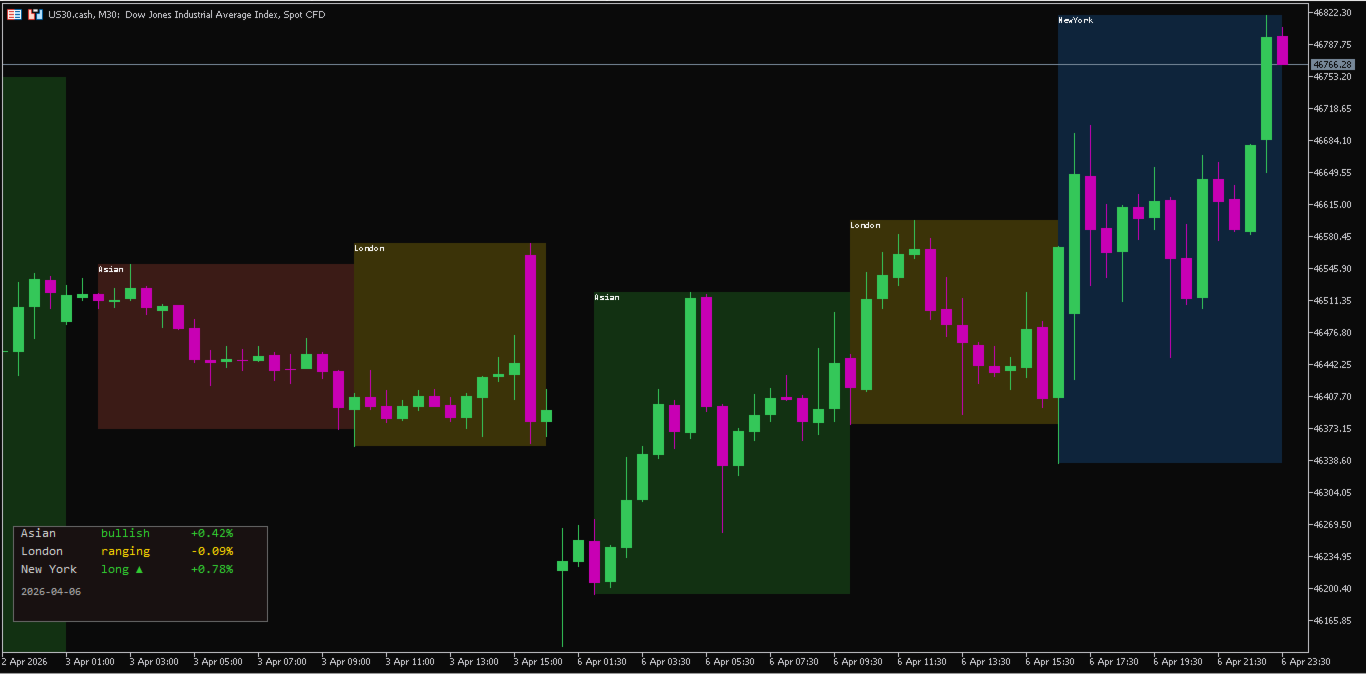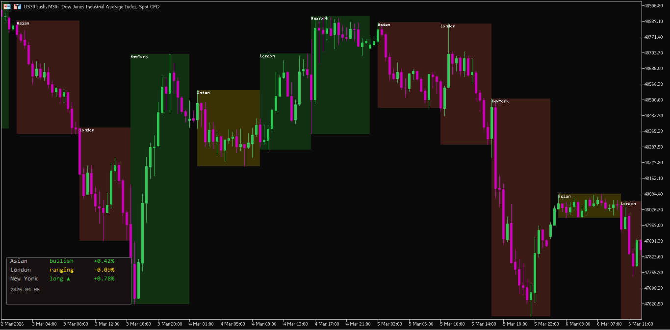 Dynamic Session Analysis: Automatically plots session boxes for Asian, London, and New York markets, with full support for overnight sessions crossing the midnight mark.