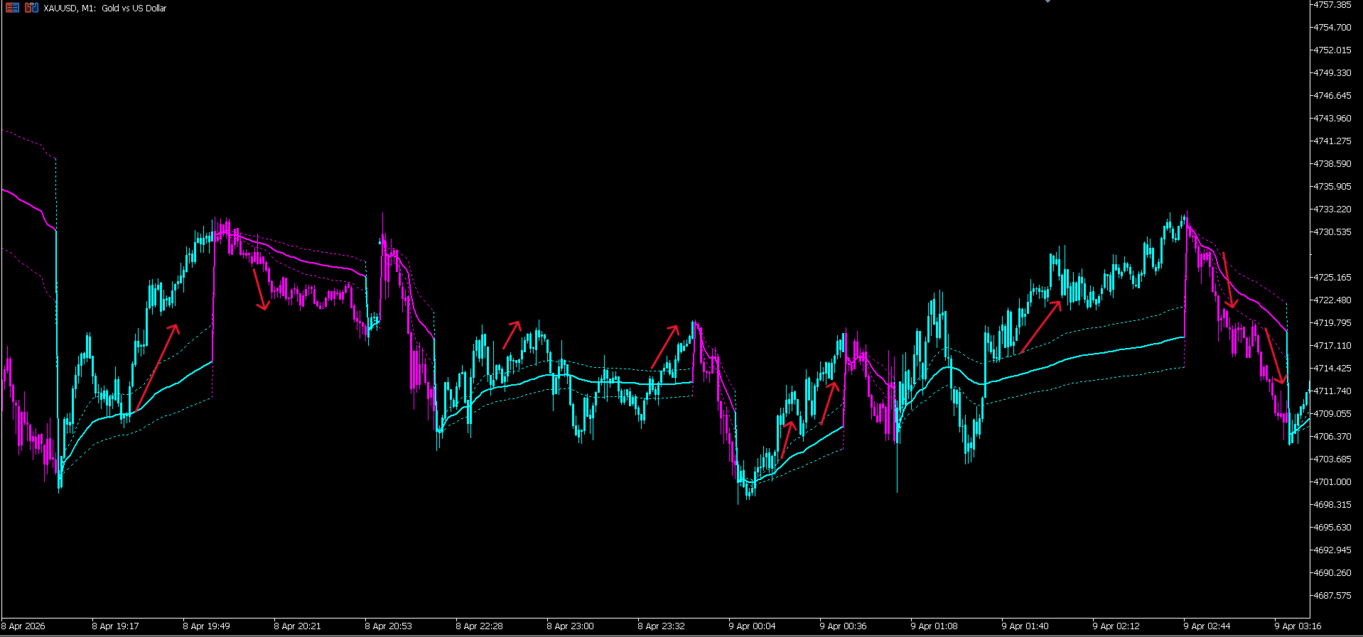 - Dynamic Bias Coloring — Candles colored by swing direction (cyan/magenta)