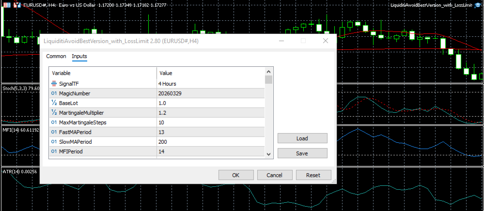 The EA identifies the primary market trend using a fast and slow moving average combination and waits for institutional-style pullbacks before entering trades.