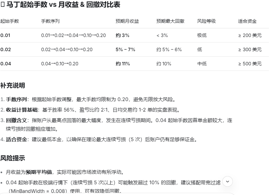 - Dynamic Martingale lot sizing (reset on profit, increase on loss, max 0.2 lots)