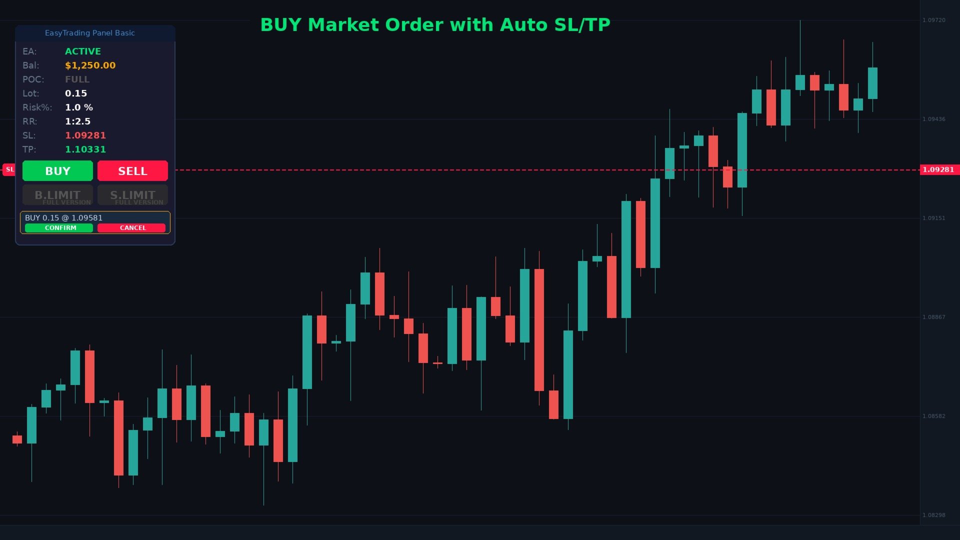 Place pending Buy Limit and Sell Limit orders with draggable Entry, TP, and auto-calculated SL lines. Includes OK/CANCEL flow with full confirmation.