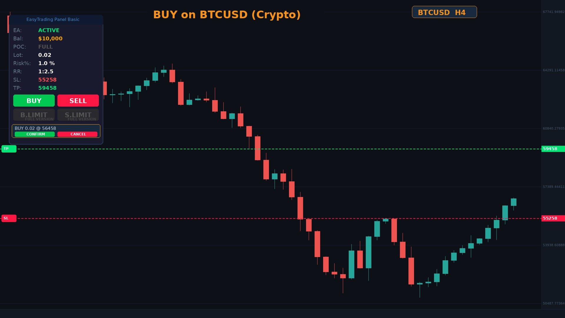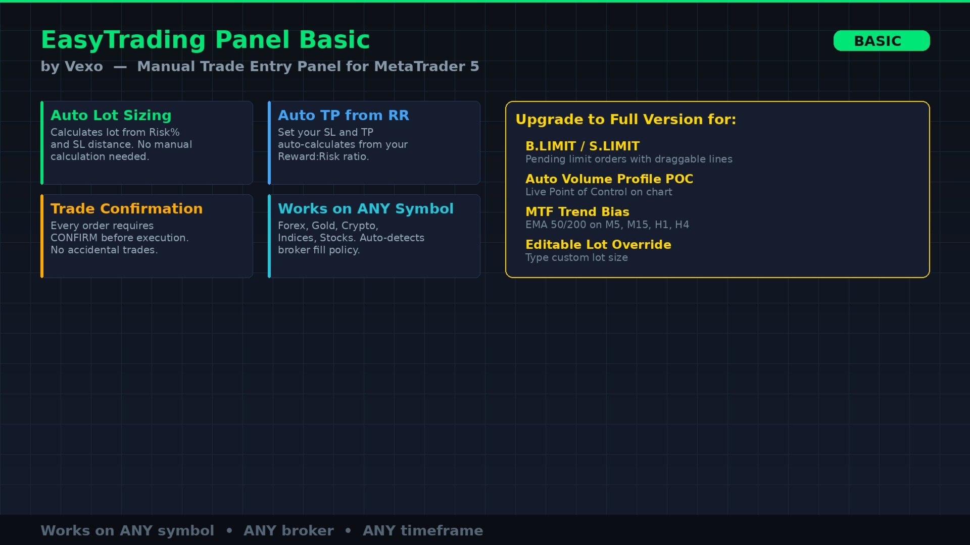 - The Basic version is fully functional for BUY/SELL market orders with auto risk sizing