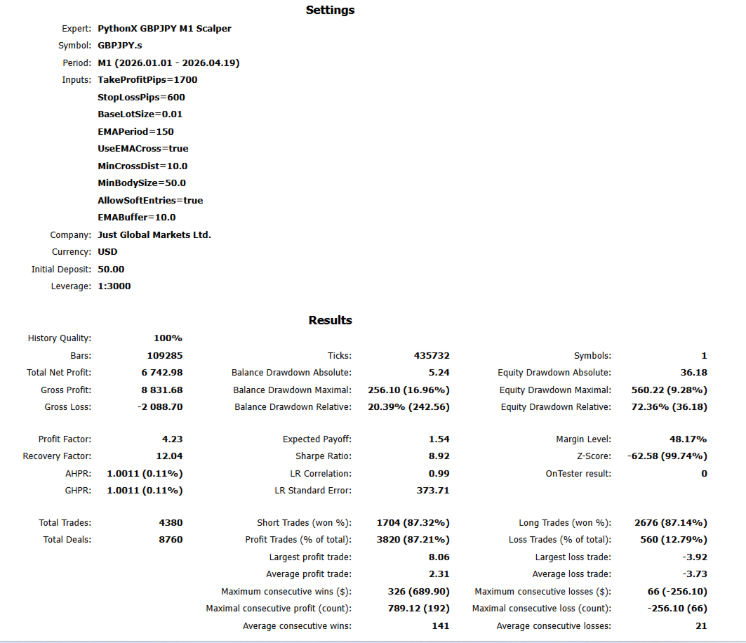 This is a high-frequency scalping system. While it is designed for controlled drawdown, improper settings, poor broker conditions, or high spreads can negatively impact results.