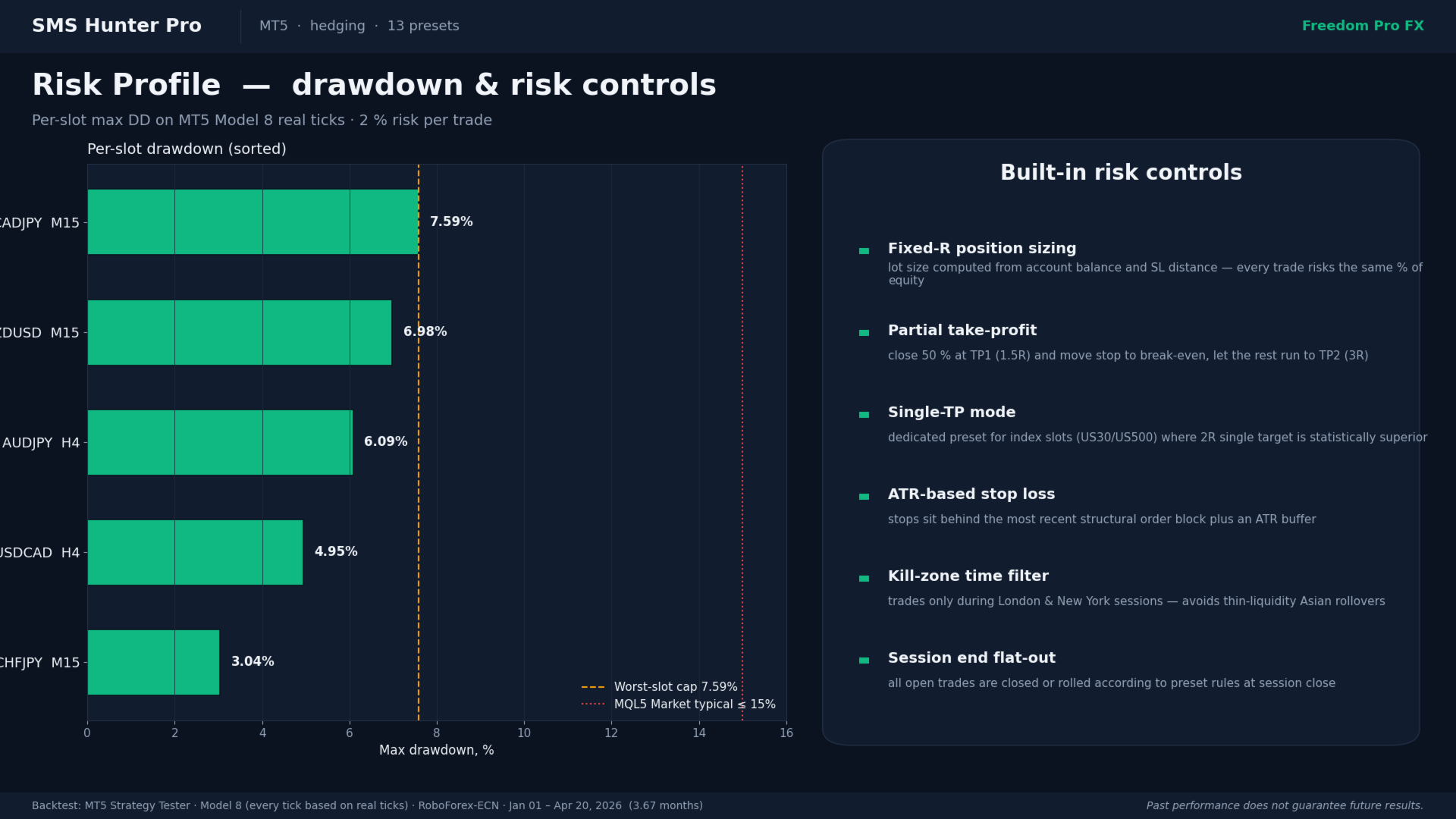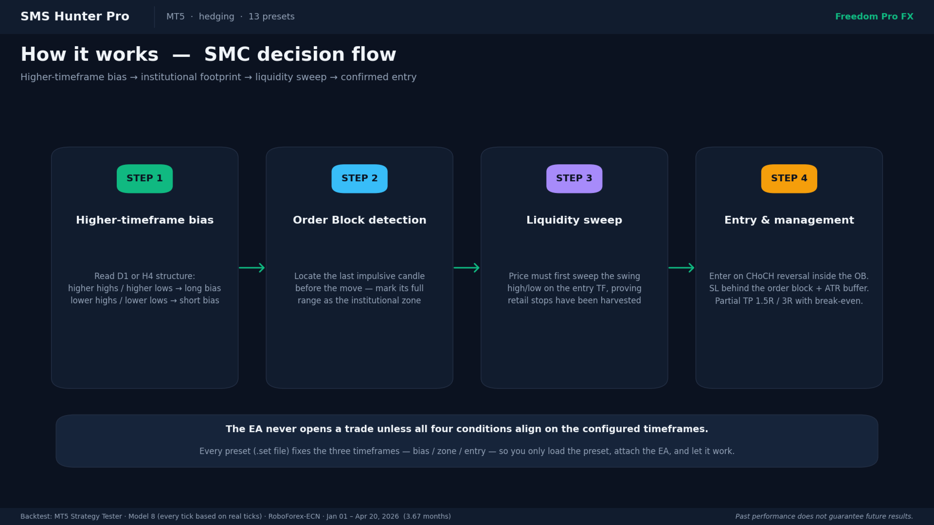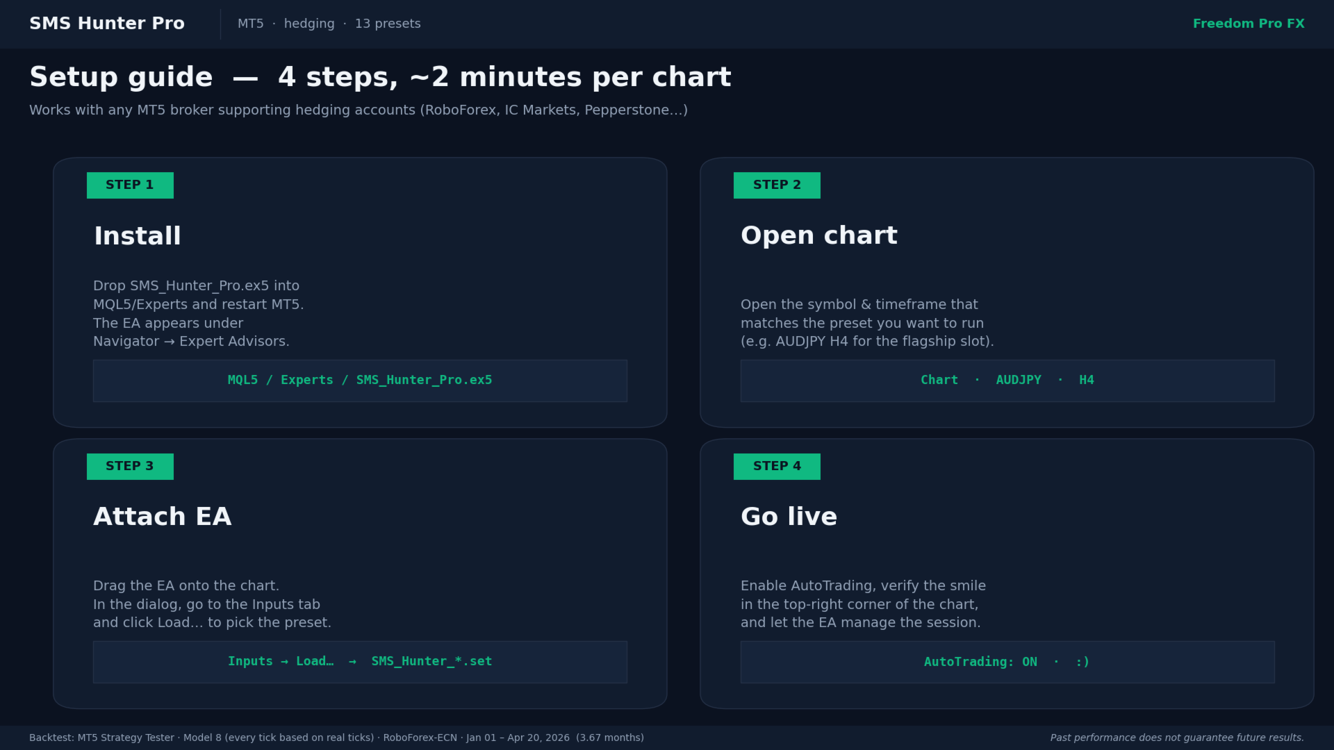 Developed by the current analytical team. SMS Hunter Pro was created by the Freedom Pro FX team — authors of the upcoming QuantView analytics platform. We trade these algorithms ourselves.
