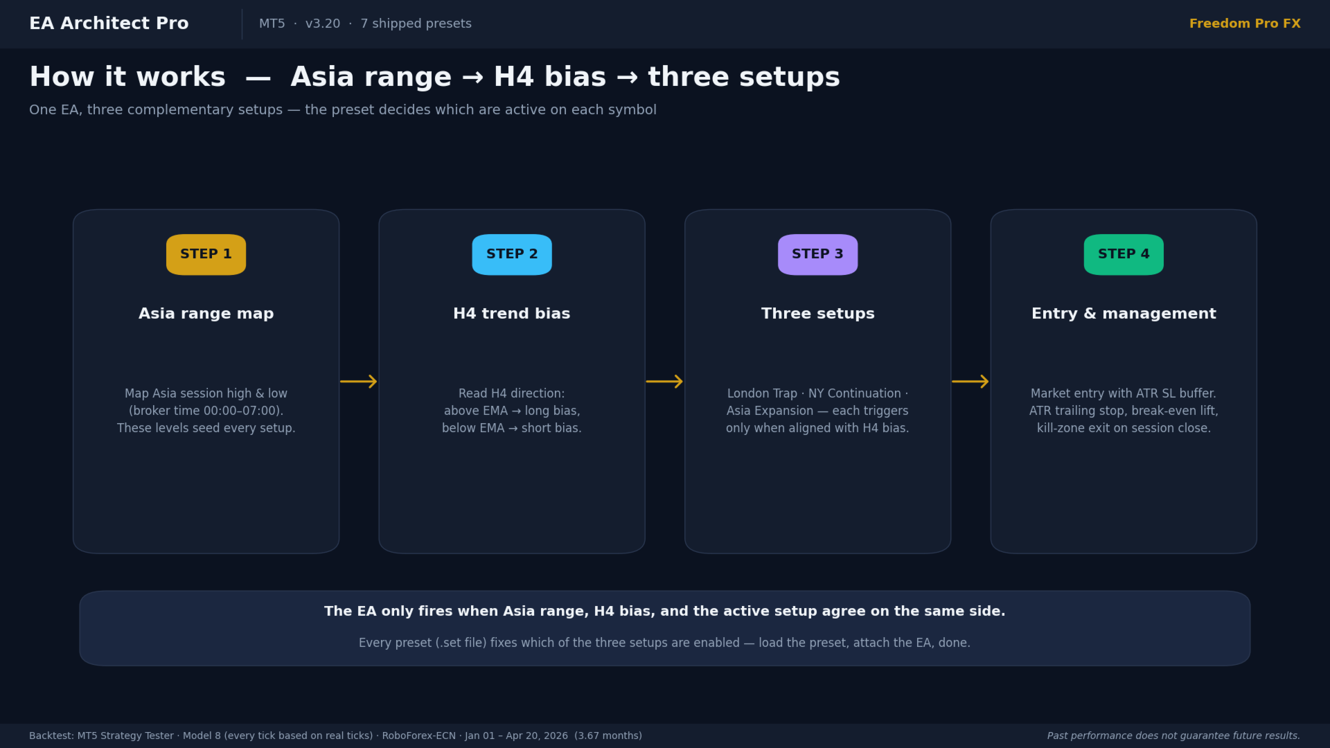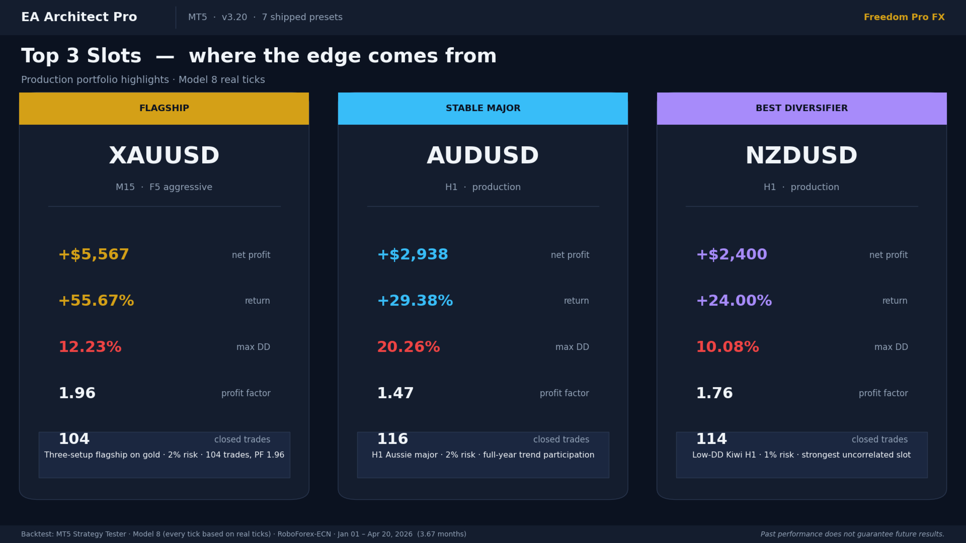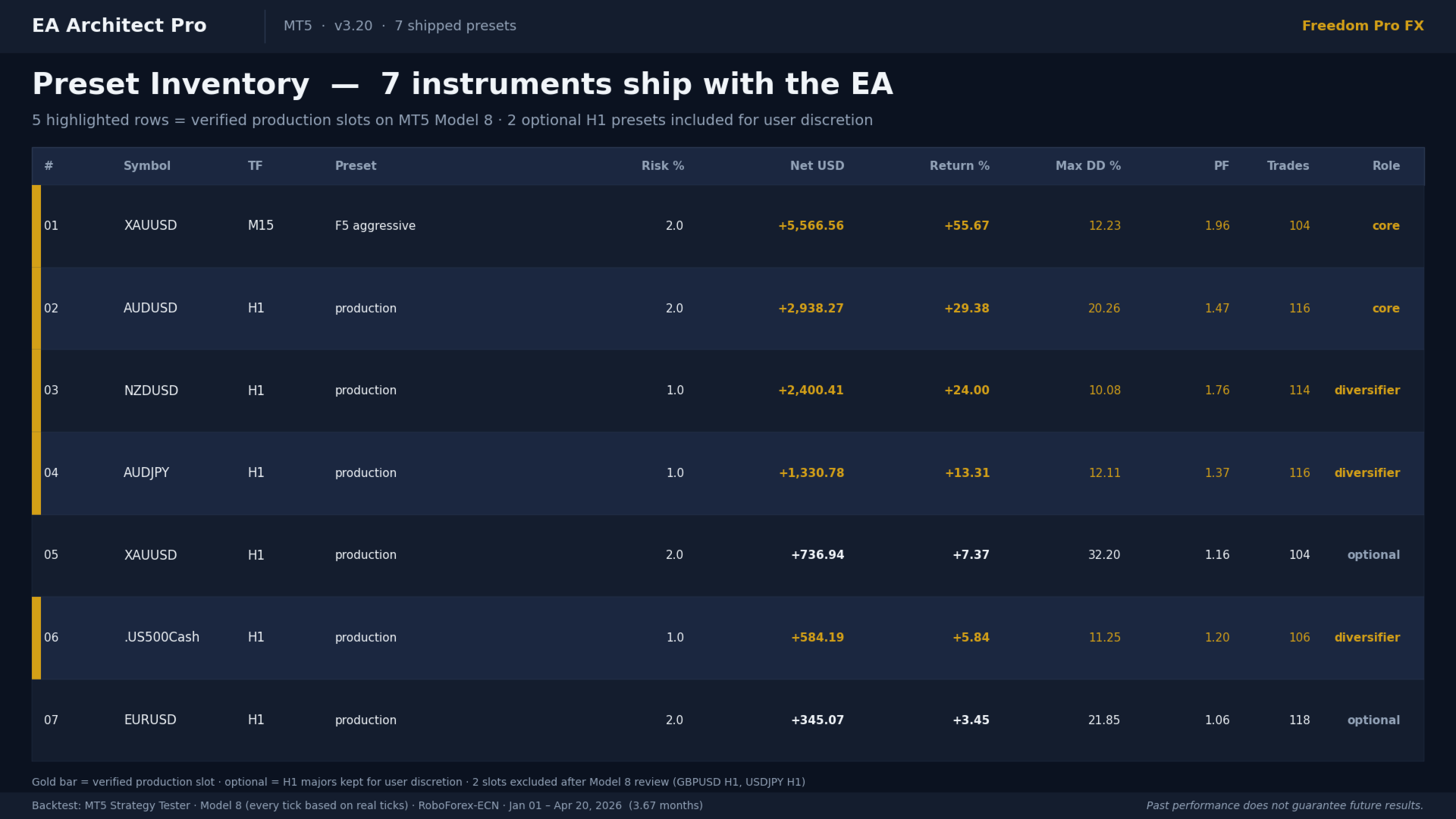 Developed by the current analytical team. EA Architect Pro was created by the Freedom Pro FX team — authors of the upcoming QuantView analytics platform. We trade these algorithms ourselves.