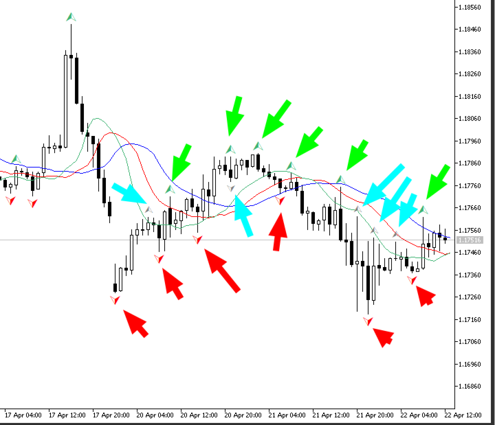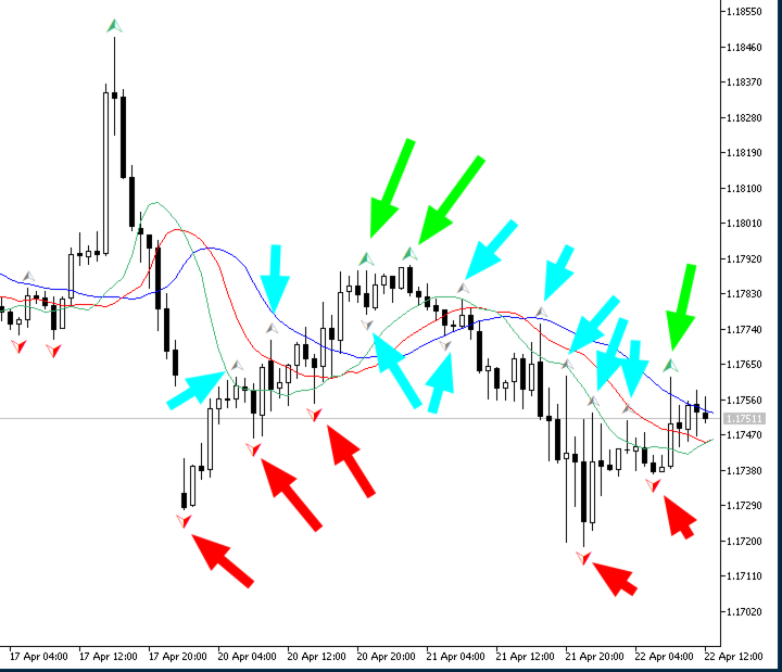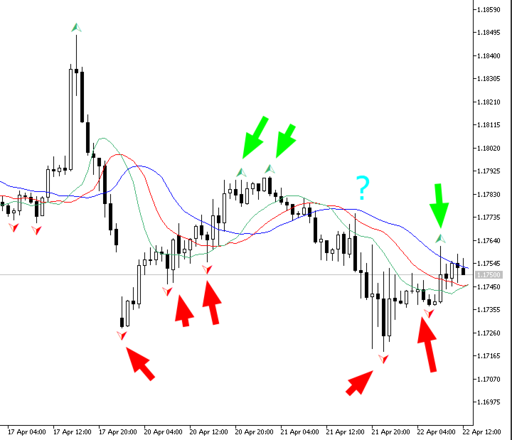 • Green arrow (▲): fractal above Alligator — valid buy signal