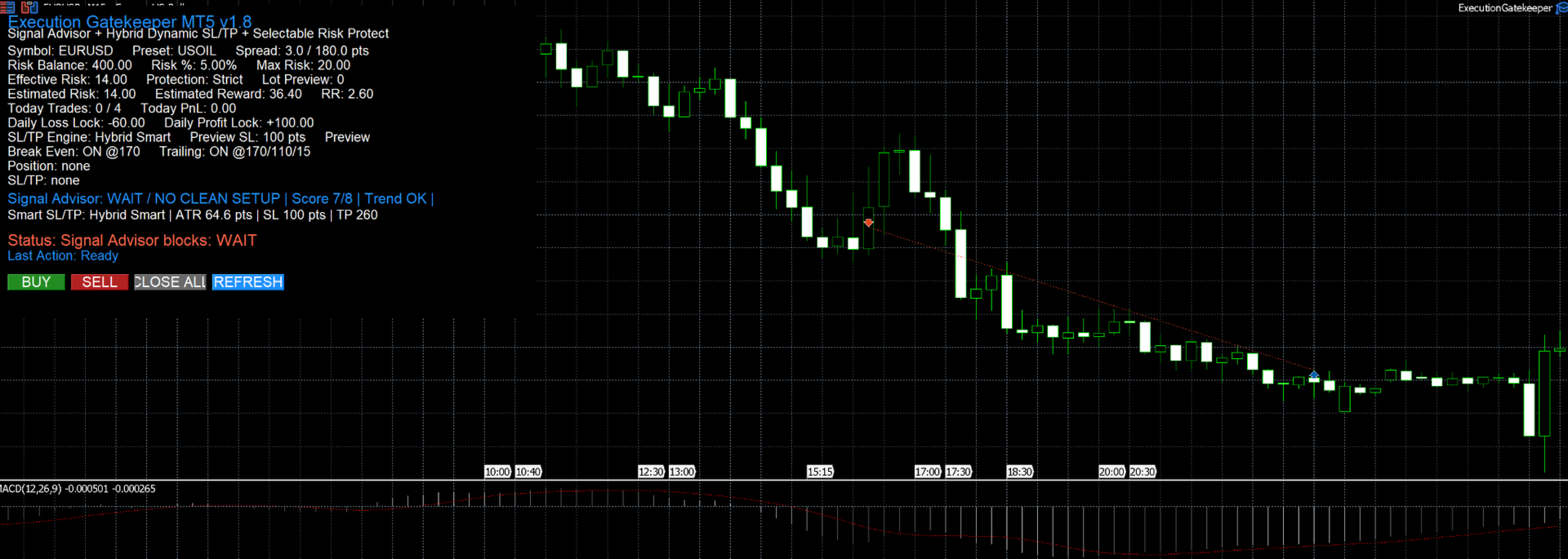 The Signal Advisor analyzes the market using fast and slow EMA, RSI, MACD and ATR to detect cleaner trading conditions.