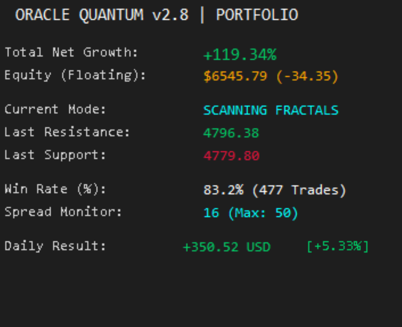Oracle Quantum is a high-end automated trading system engineered to detect and exploit market structural shifts and volatility expansions. Built on quantitative analysis, the EA distinguishes between genuine directional momentum and market noise, ensuring high-probability execution in pressurized market environments.