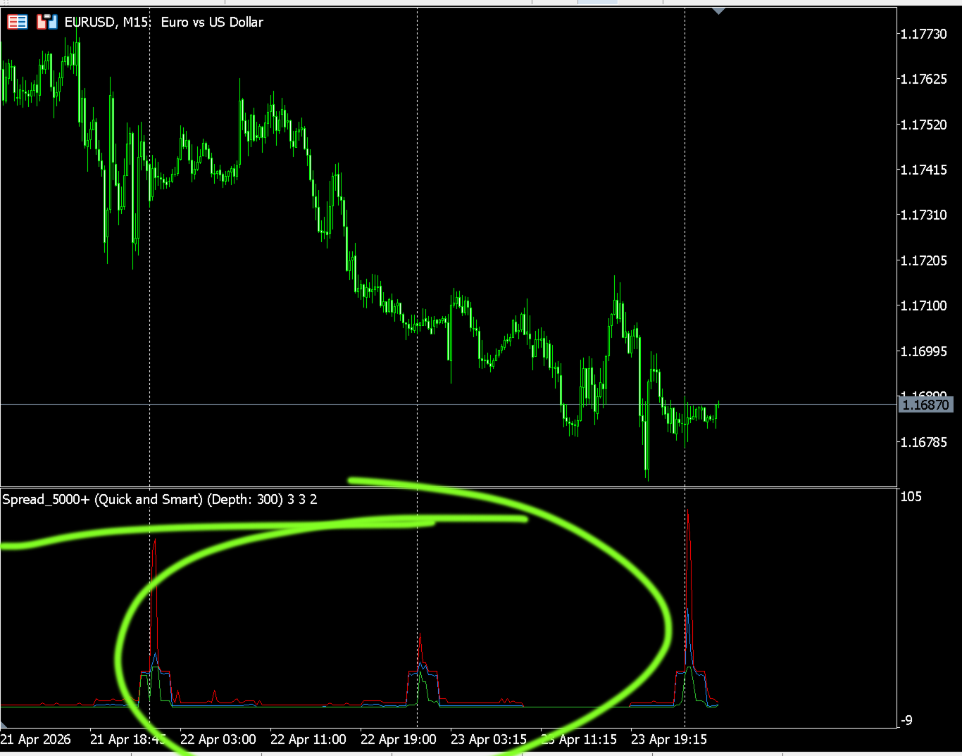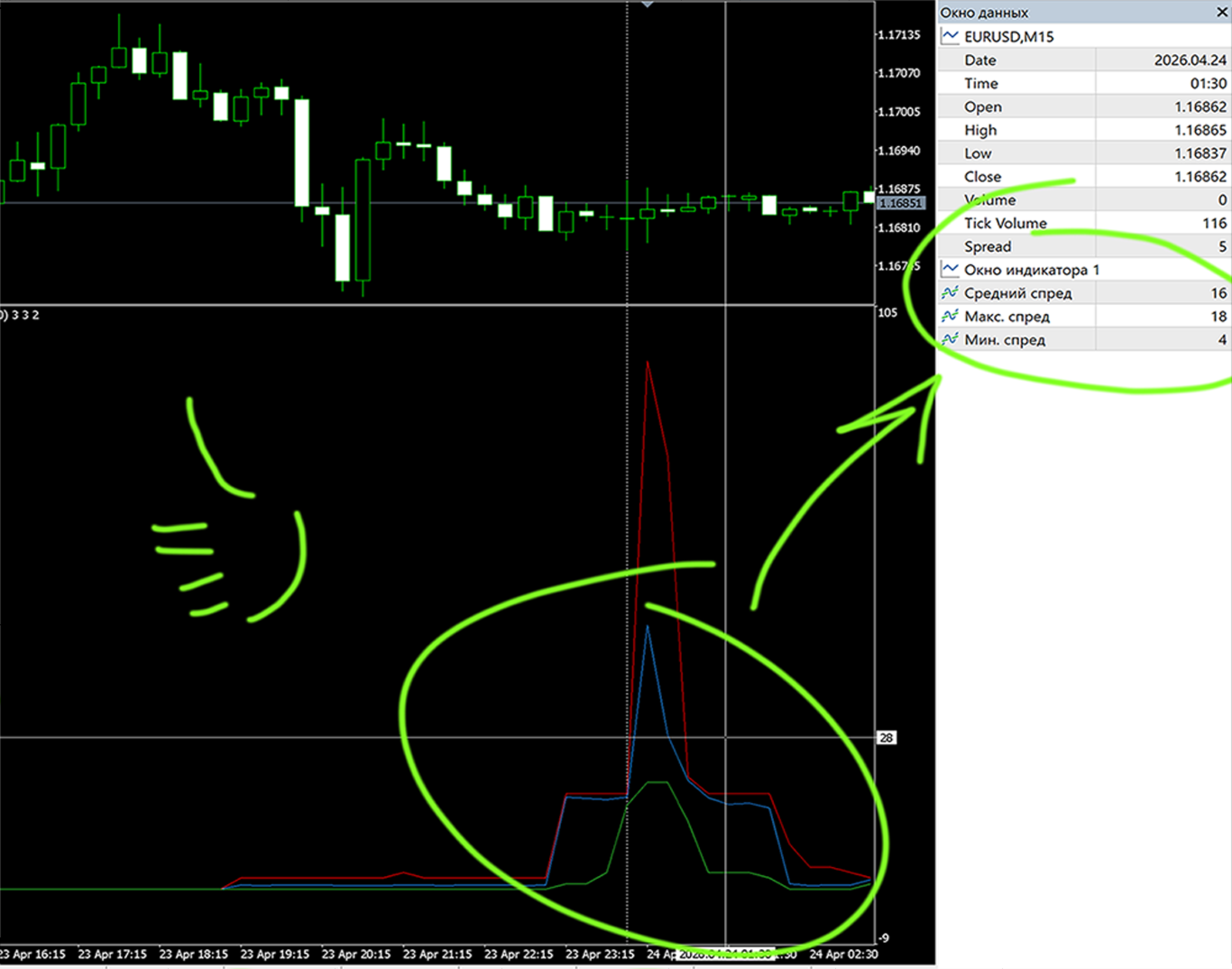 Very often, you need to look at spreads for the entire day. But such statistics are hard to find. I decided to write a simple indicator for myself. Extra statistics are never too much. It saves me a hundred times over in time!