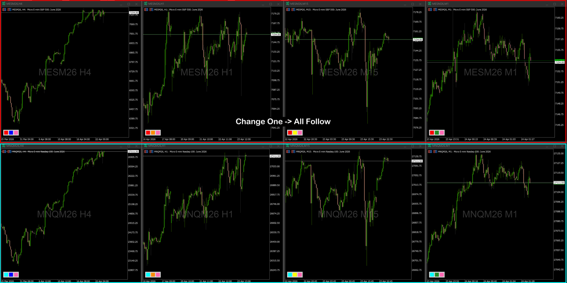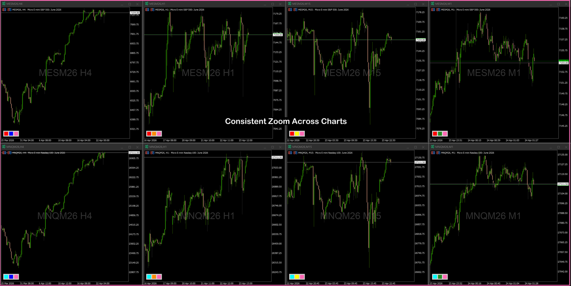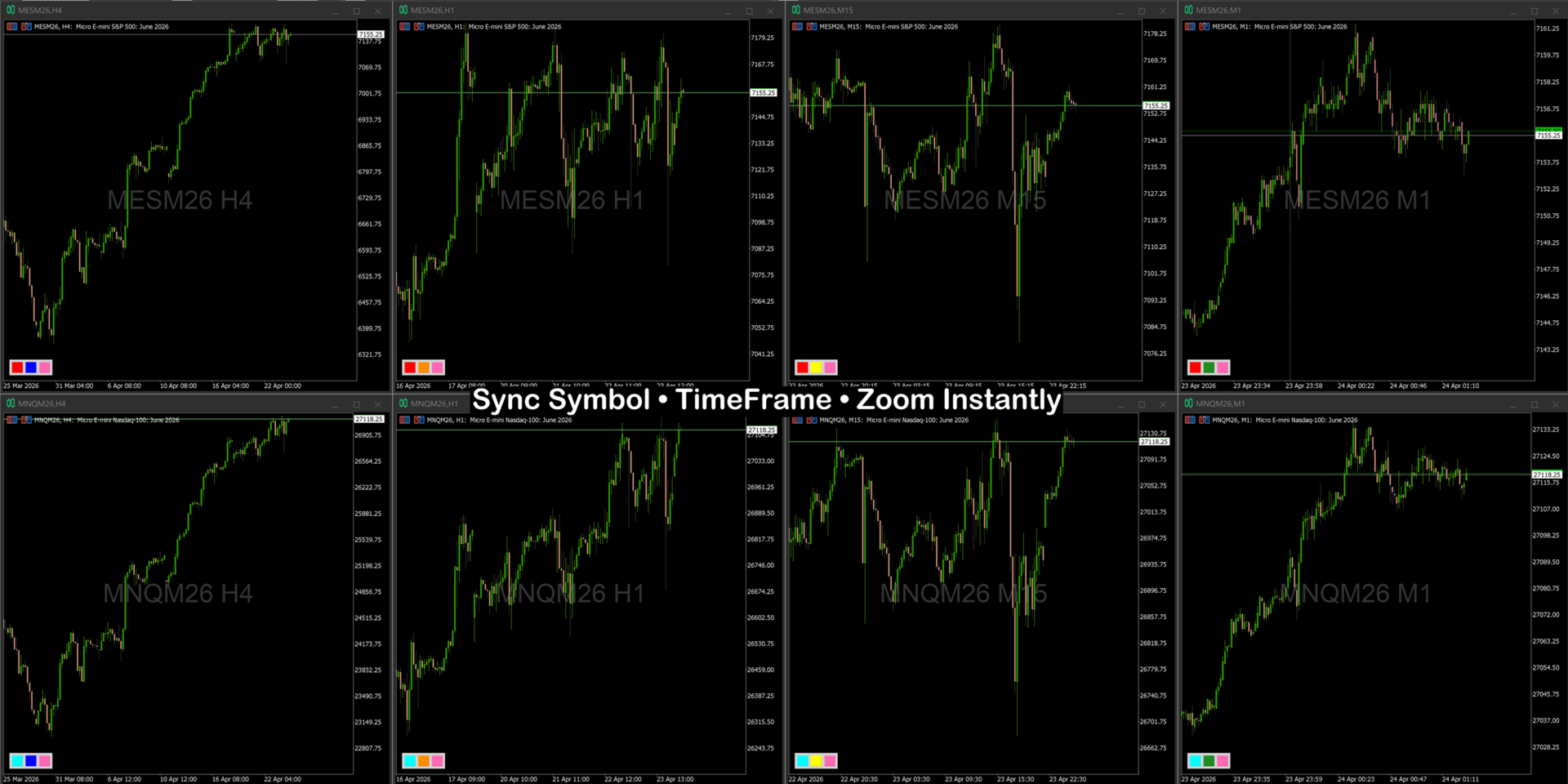 Switch timeframes on one chart → all grouped charts match automatically