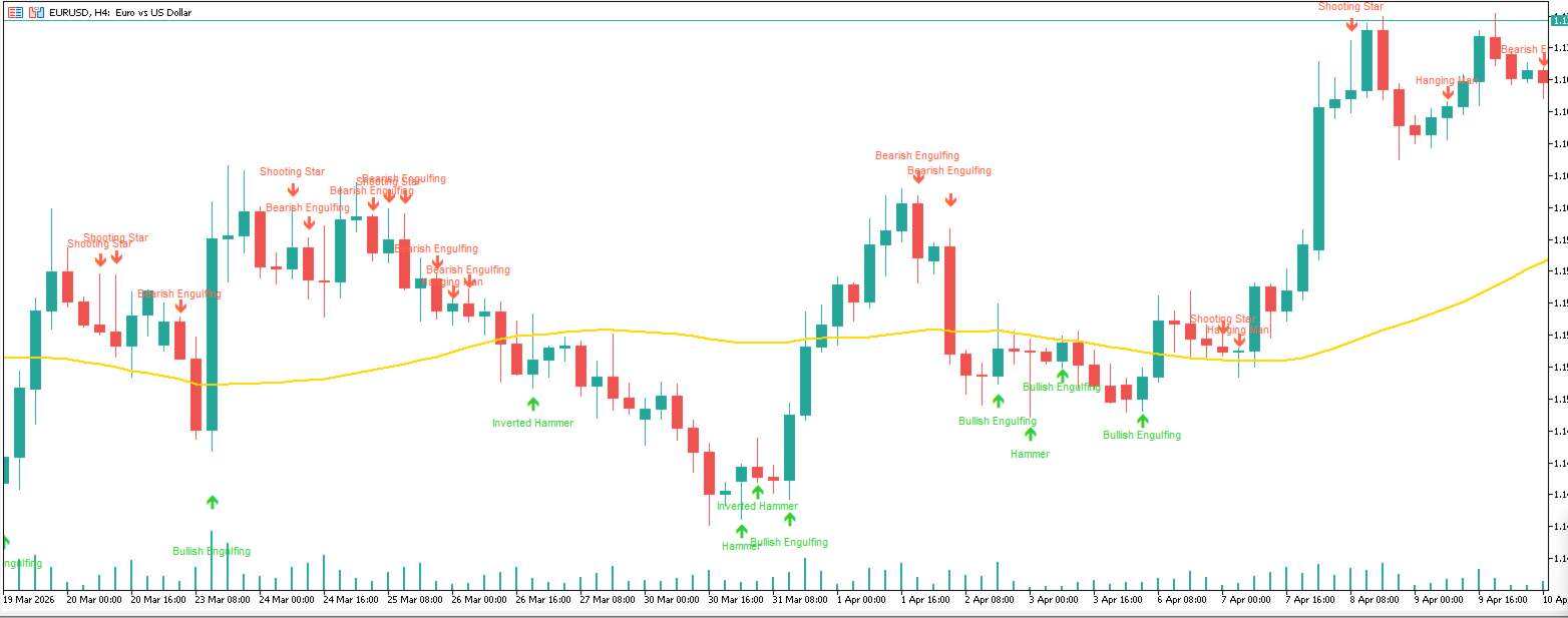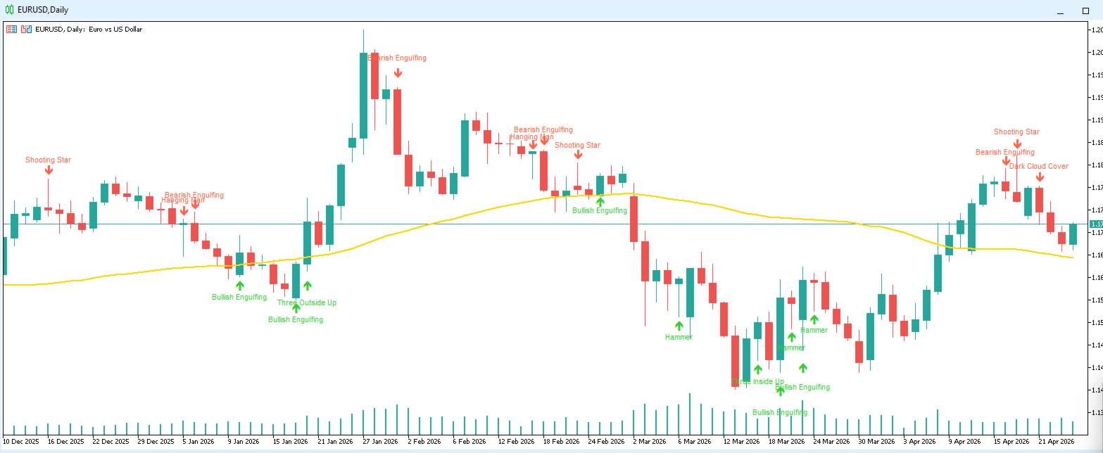 Candlestick Patterns Standard helps you quickly see where an important candlestick setup has appeared. You do not need to manually inspect every candle or remember all pattern conditions — the indicator does the detection automatically.