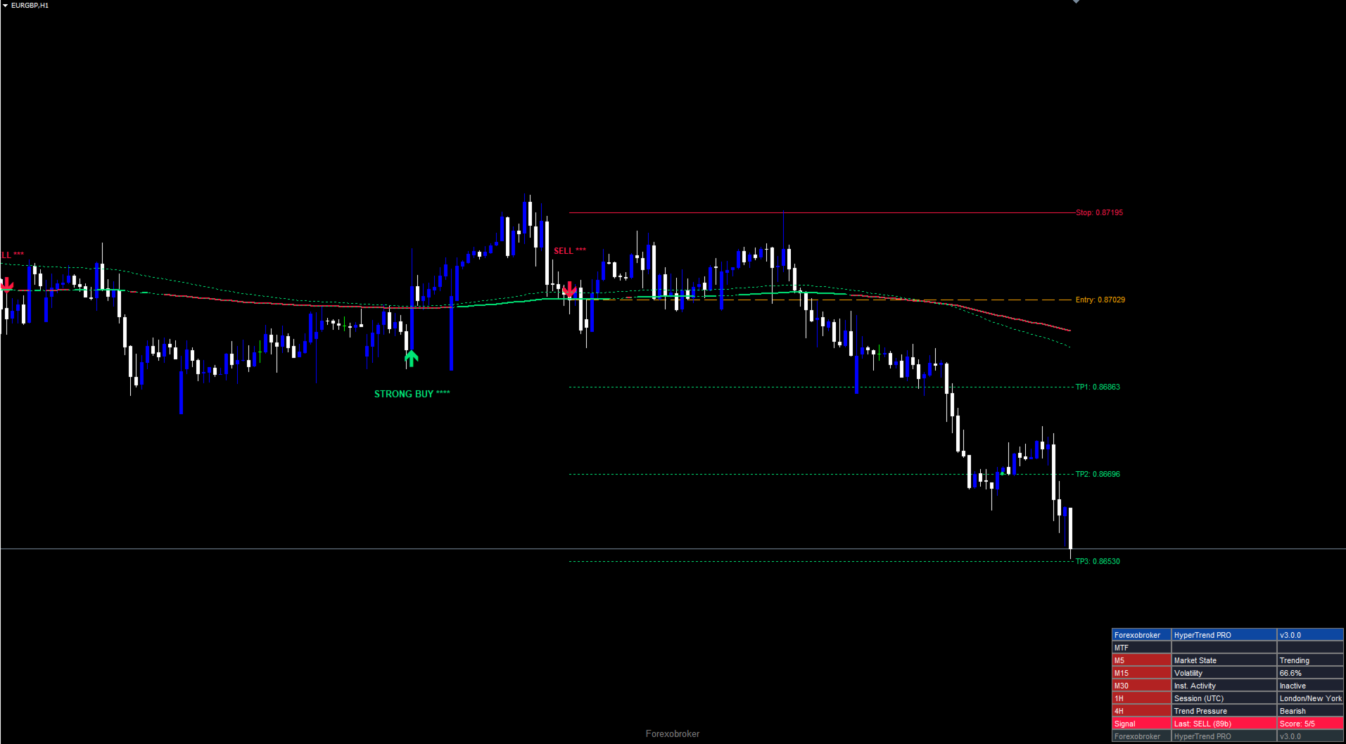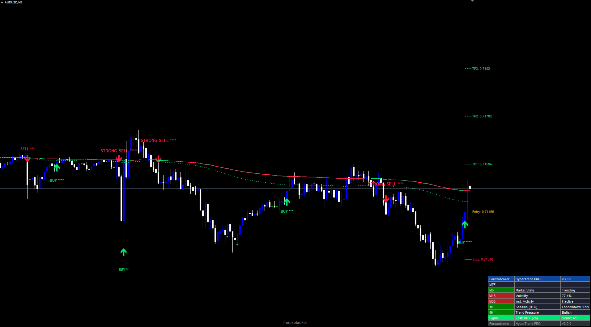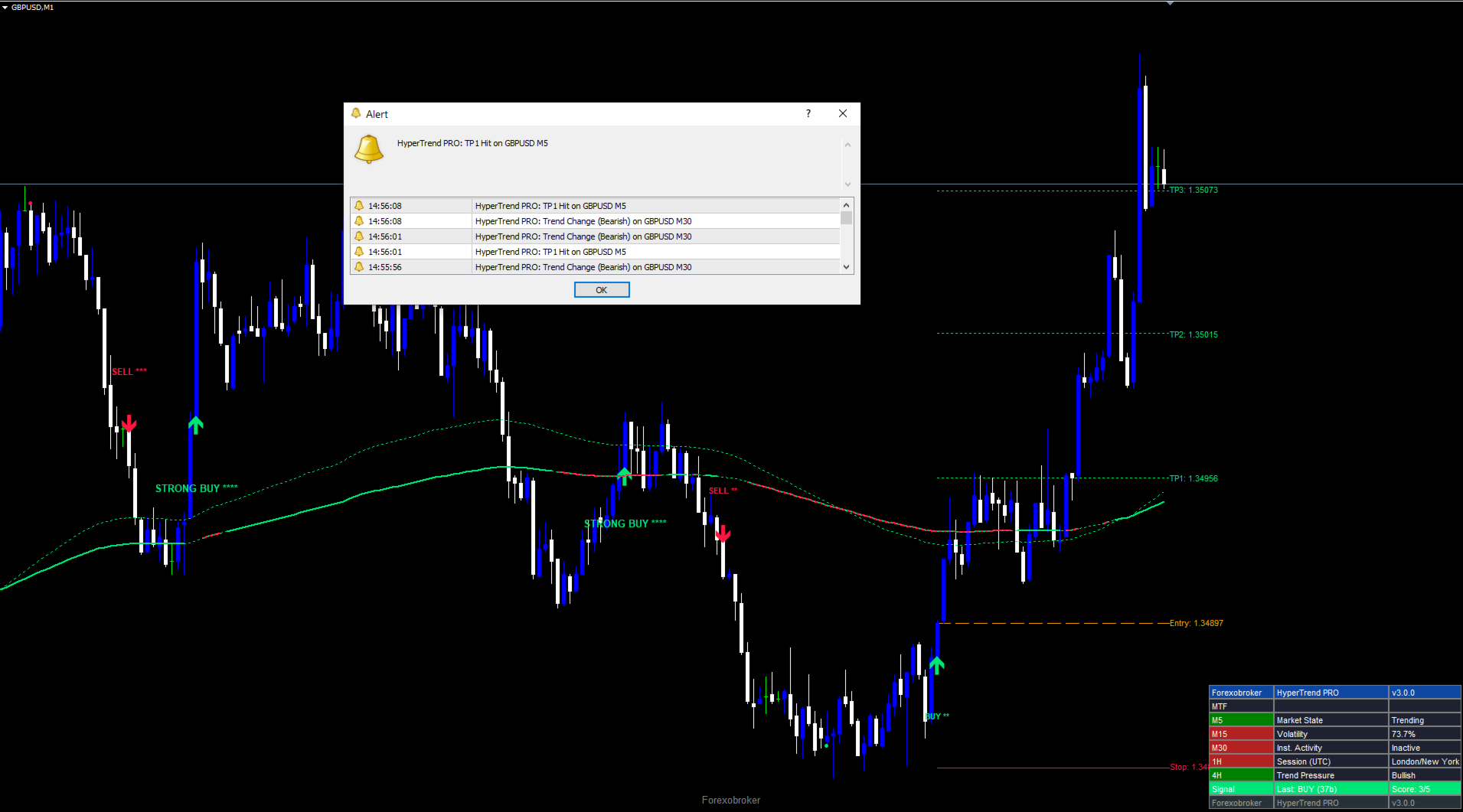 Hyper Trend PRO는 MetaTrader 5용 비재도색 적응형 추세 추종 지표입니다. SuperTrend 엔진과 5가지 요소 컨플루언스 점수를 결합하여 높은 확률의 매수 및 매도 신호를 생성합니다. 각 신호는 MACD 히스토그램, EMA 클라우드 정렬, ADX 추세 강도, 거래량 급증, HMA 기울기라는 독립적인 요소 중 몇 가지가 움직임을 확인하는지에 따라 0에서 5까지 평가됩니다. 풀백 재진입 신호, 역추세 반전 엔진, 적응형 Trend Tracer 라인, 그리고 맞춤형 EMA 추세 클라우드가 완전한 시각적 트레이딩 시스템을 구성합니다. ATR 기반 스톱 로스와 세 가지 테이크 프로핏 레벨이 체계적인 리스크 관리를 제공하며, 실시간 대시보드는 방향, 강도, 요소 상태 및 거래 레벨 도달 상황을 추적합니다. 9가지 알림 유형이 팝업, 사운드, 푸시 및 이메일 채널을 통해 모든 이벤트를 커버합니다.