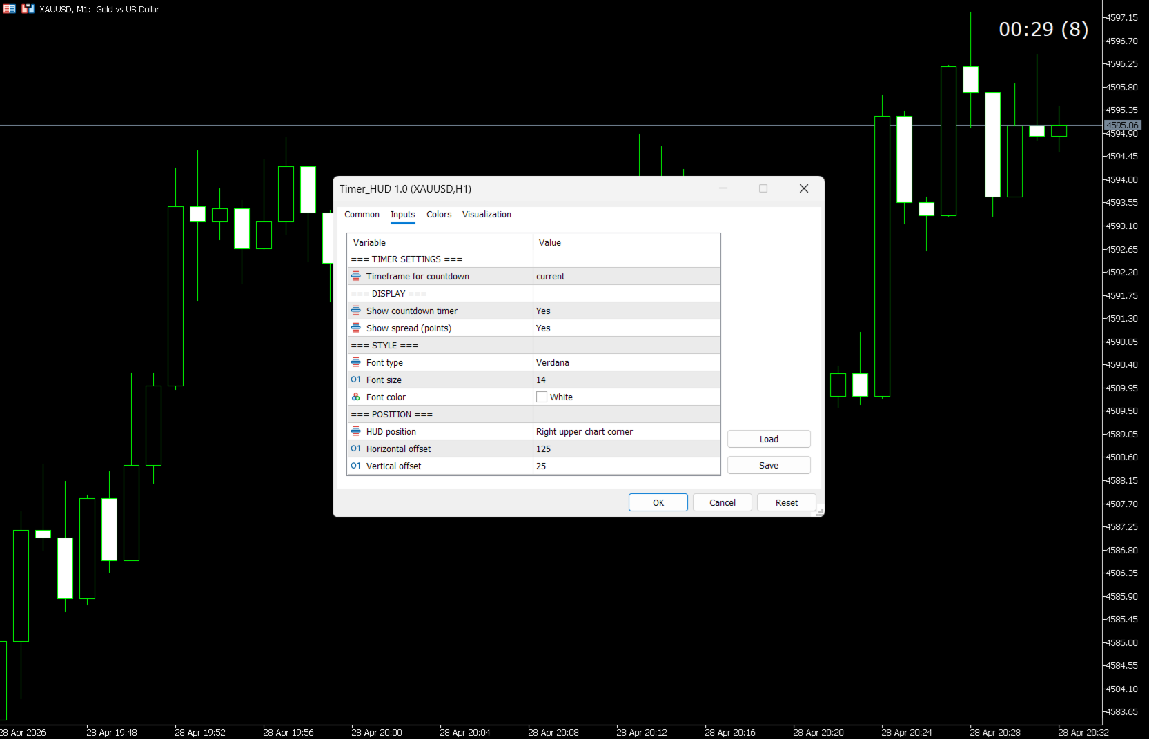 Timer HUD는 차트 위에 실시간 시장 정보를 표시하는 경량 도구로, 현재 캔들의 카운트다운과 스프레드 표시를 결합합니다.