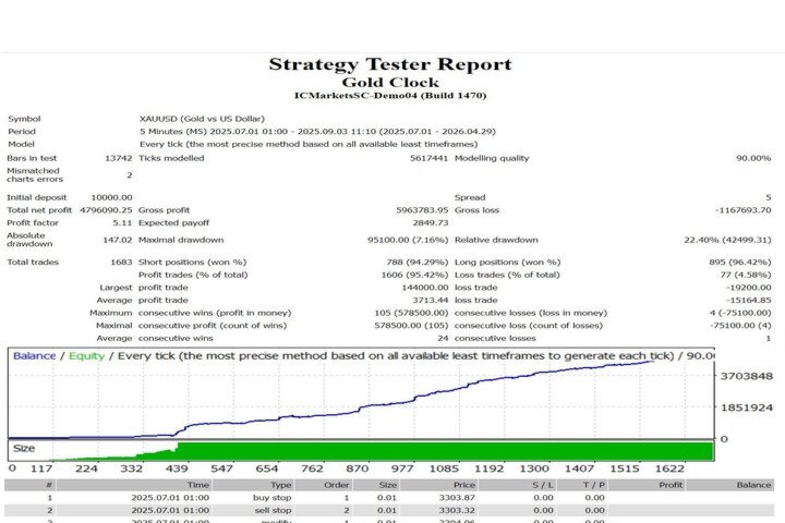 This Forex Robot strategically enters trades based on optimal timing and the most favorable market conditions. The exit logic combines multiple advanced algorithms to protect profits and reduce drawdowns. These algorithms ensure trades are closed at the most advantageous times, securing gains and minimizing potential losses. Gold Clock operates throughout the entire trading session, maximizing your earning potential.