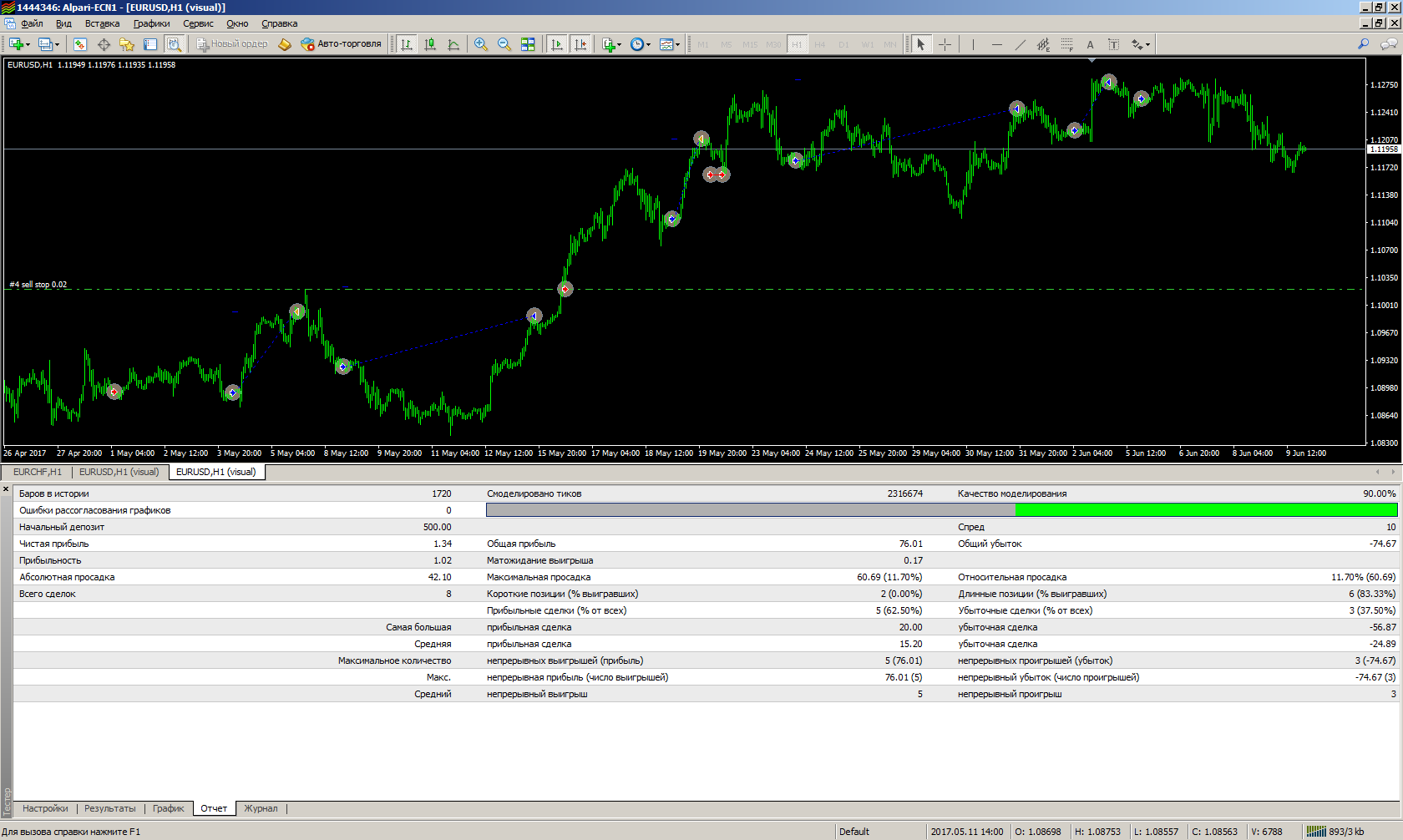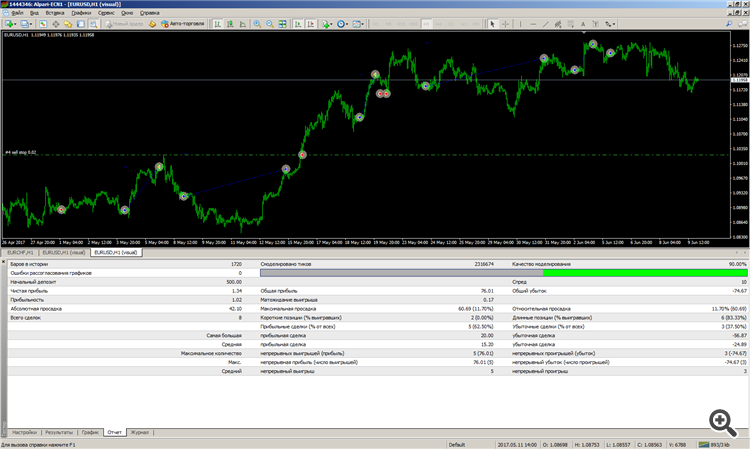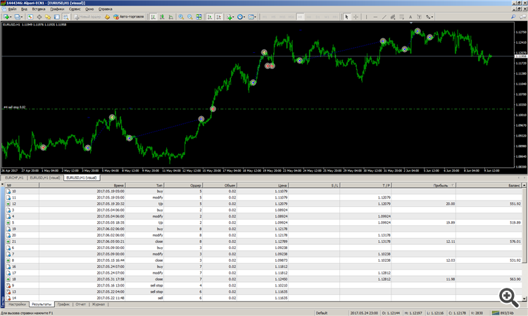 29/05/2017 мы разместили архив (trendraptor2017_42w.zip ) с настройкой и результатами теста, так же и вам он был выслан. В результатах теста Вы видите за период с 01/04/2015 по начало 2017 года прибыль с 10 000 депозита составила более 200 000. За шесть дней торговли при движении котировки по EURUSD всего 170 пунктов вверх сколько вы сделок хотите чтобы открыл советник? 02/06/2017 советник открыл сделку на покупку и зафиксировал в понедельник на открытии рынка прибыль 61 пункт, на момент написания этого ответа в рынке сделка так же на покупку, текущий профит +22 пункта. Цена открытия второй сделки на покупку ниже на 19 пунктов фиксирования прибыли предыдущей сделки. Сейчас мы в профите и котировка находится чуть выше уровня фиксирования профита предыдущей сделки, на 1,12813.
