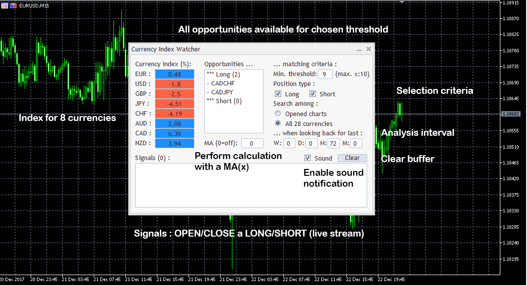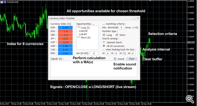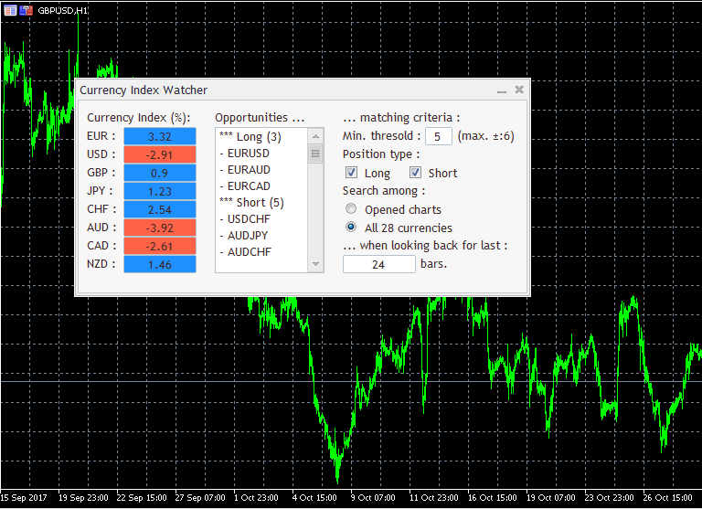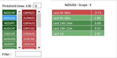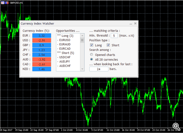 - First click on a pair's name adds its curve to a chart, second click remove pair's curve from the chart. - Autoscaling chart units depending on the timeframe used to reduce computing delays on higher timeframes :